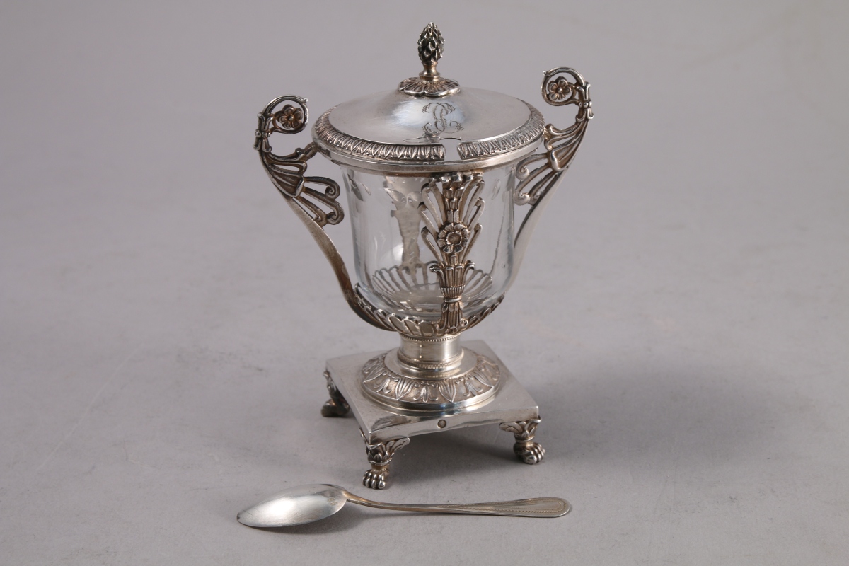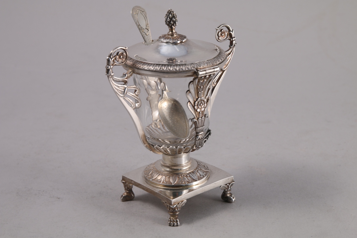MOUTARDIER en argent, le couvercle de forme circulaire orné d'une frise de feuilles de lotus et prise en pomme de pin. Deux anses à palmes enroulées et deux palmes fleuries ajourés reposent sur une base quadrangulaire ornée d'une frise de lotus et feuille d'eau, soutenue par quatre pieds griffes.