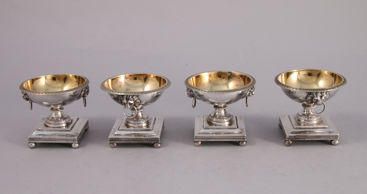 Suite de QUATRE SALERONS en argent adoptant la forme d'une vasque bordée d'une frise de palmettes. Le bassin vermeillé. Elle repose sur un piédouche orné de même. Anses latérales figurant un masque léonin enserrant un anneau mobile dans sa gueule. Base de forme carrée à doucine reposant sur quatre pieds boule.