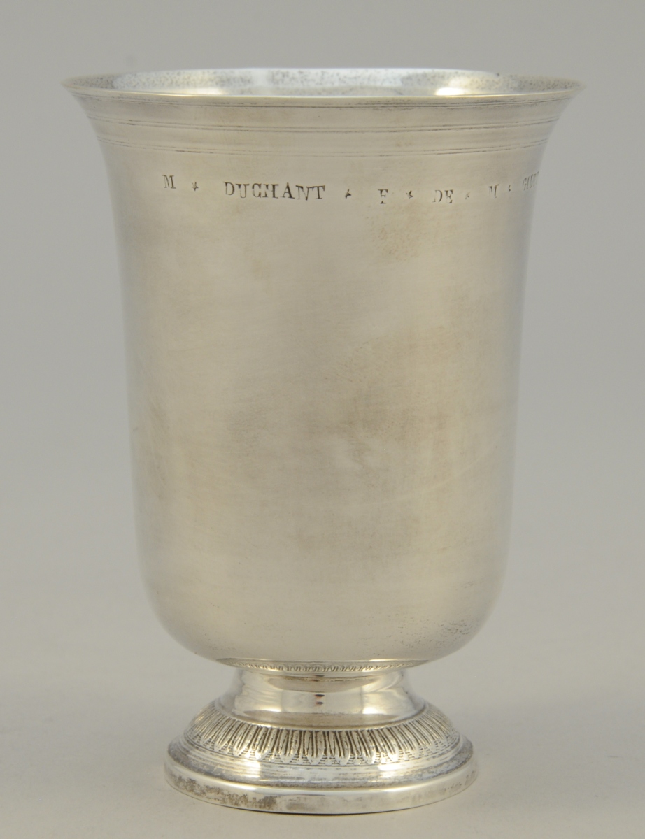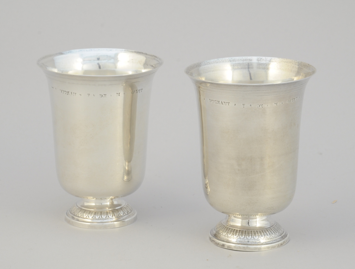 DEUX TIMBALES dites TULIPE en argent uni reposant sur un piédouche orné d'une frise de feuilles d'eau. Le col souligné de filets. Marquée "M * DUCHANT * F * DE * M * GILET *".