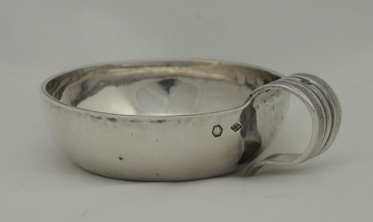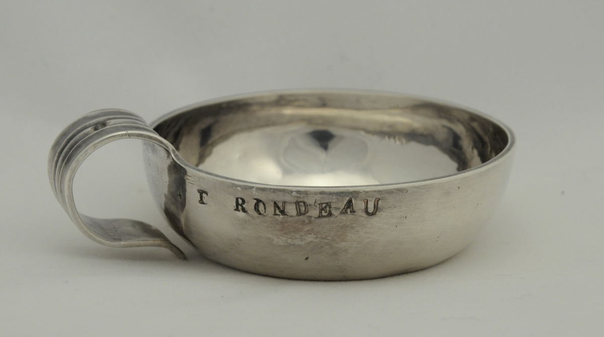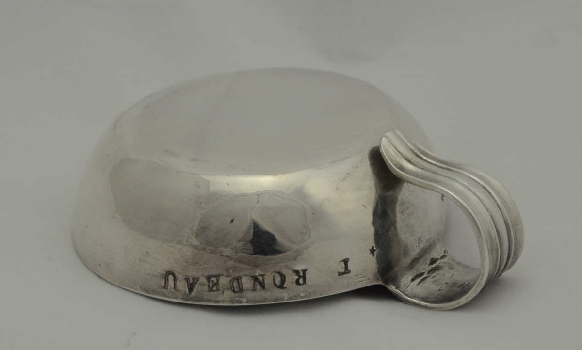 TASTEVIN en argent uni marqué "* E RONDEAU". Anse à enroulement cannelée.