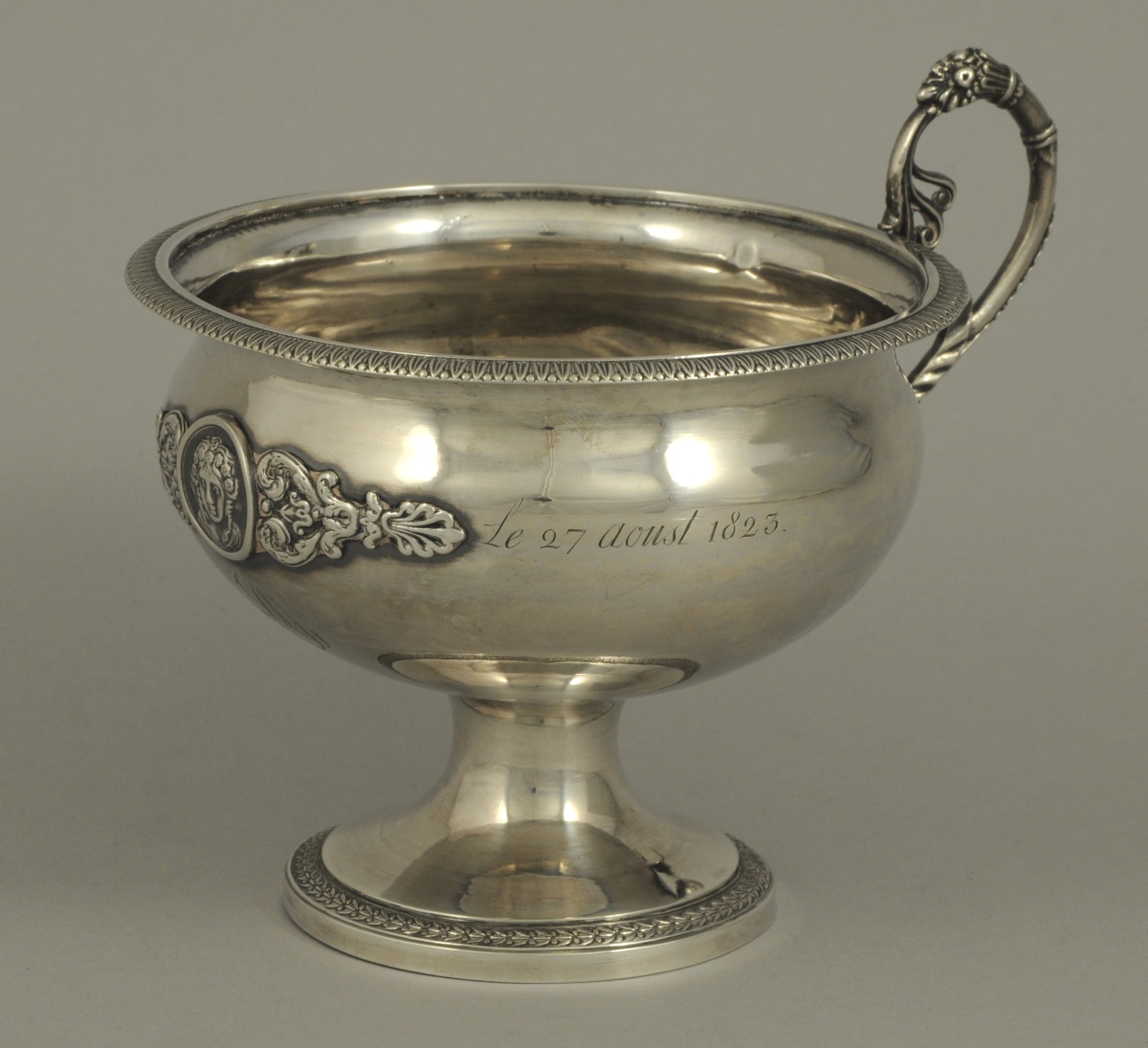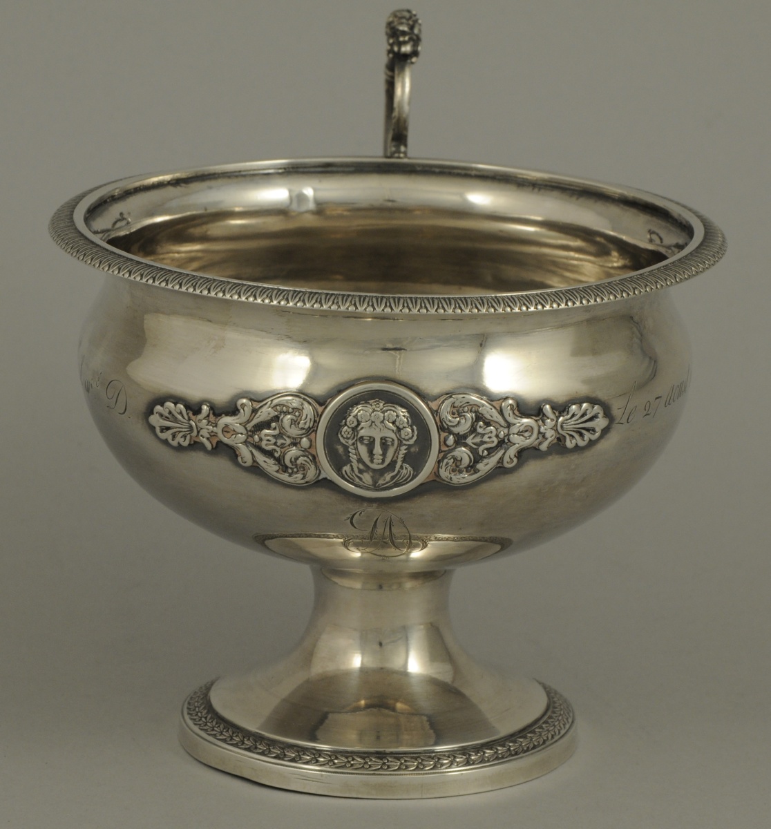 COUPE DE MARIAGE en argent. Le col ciselé d'une frise de feuilles d'eau. L'anse à corne d'abondance et volutes feuillagées. La panse à décor appliqué d'un médaillon figurant une tête de femme flanquée de motifs floraux et palmettes. Elle repose sur un piédouche à frise feuillagée. Gravée " G a Laré. D / Le 27 aoust 1823" et monogrammée "DA".
