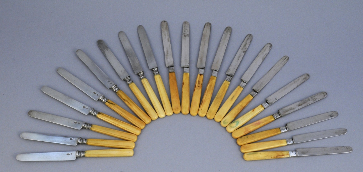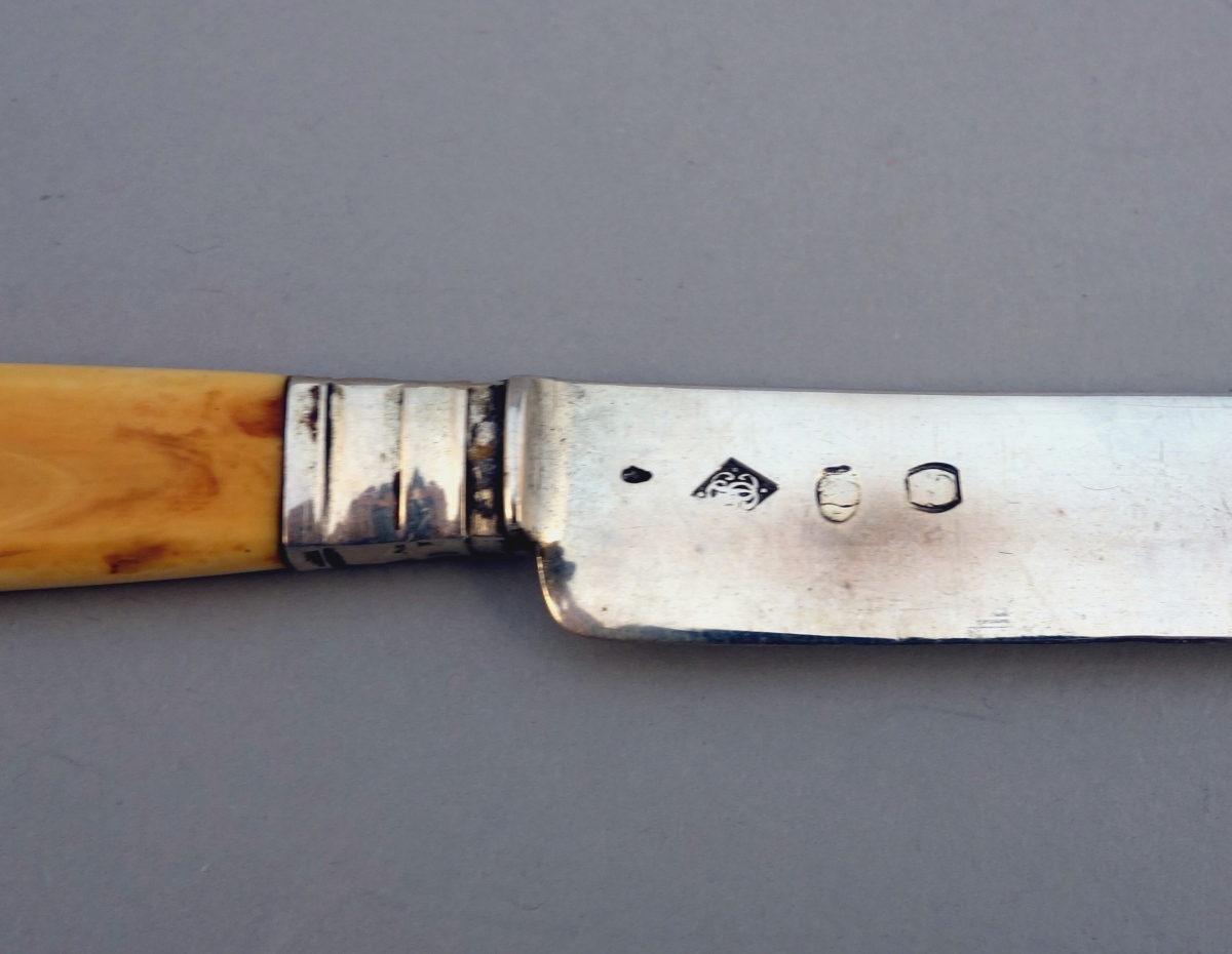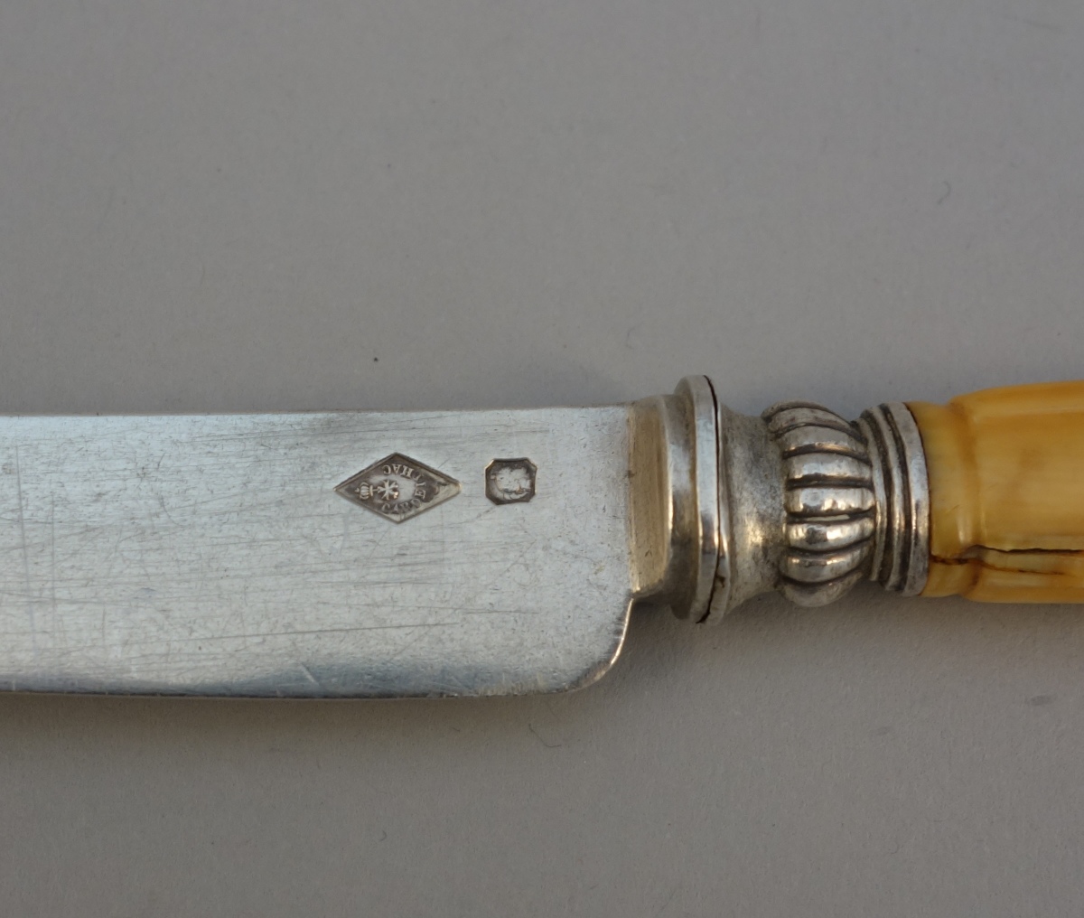Suite de 12 COUTEAUX À FRUITS. Lame en argent, manche en ivoire.
