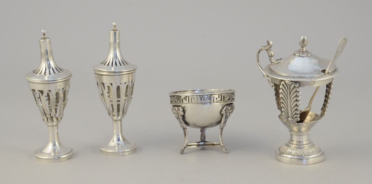 -SALIÈRE de forme ronde ornée d'une frise de grecques ajourée reposant sur trois pieds sabot à attache figurant une tête de gorgone.