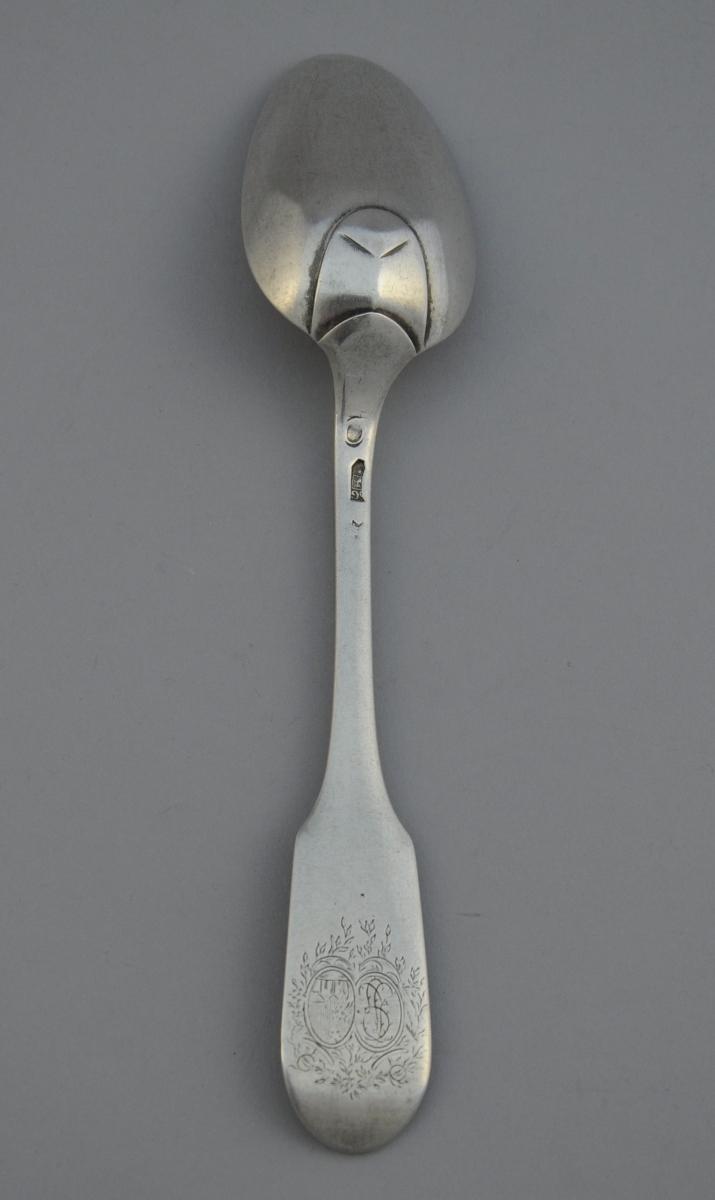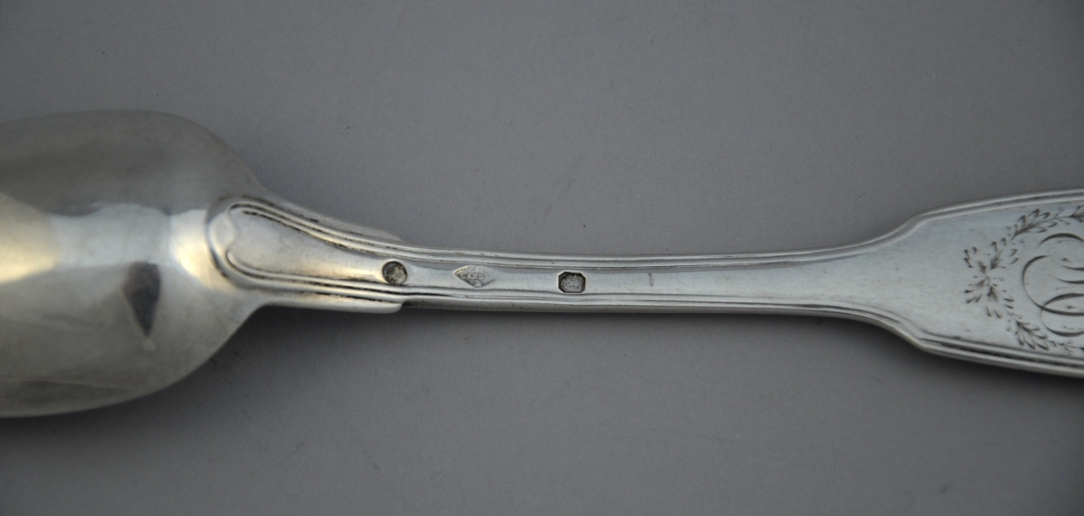 - CUILLÈRE, modèle uniplat, monogramée "LC". Poinçon 1er Coq. Province, 1798-1809. Poids : 60 g.