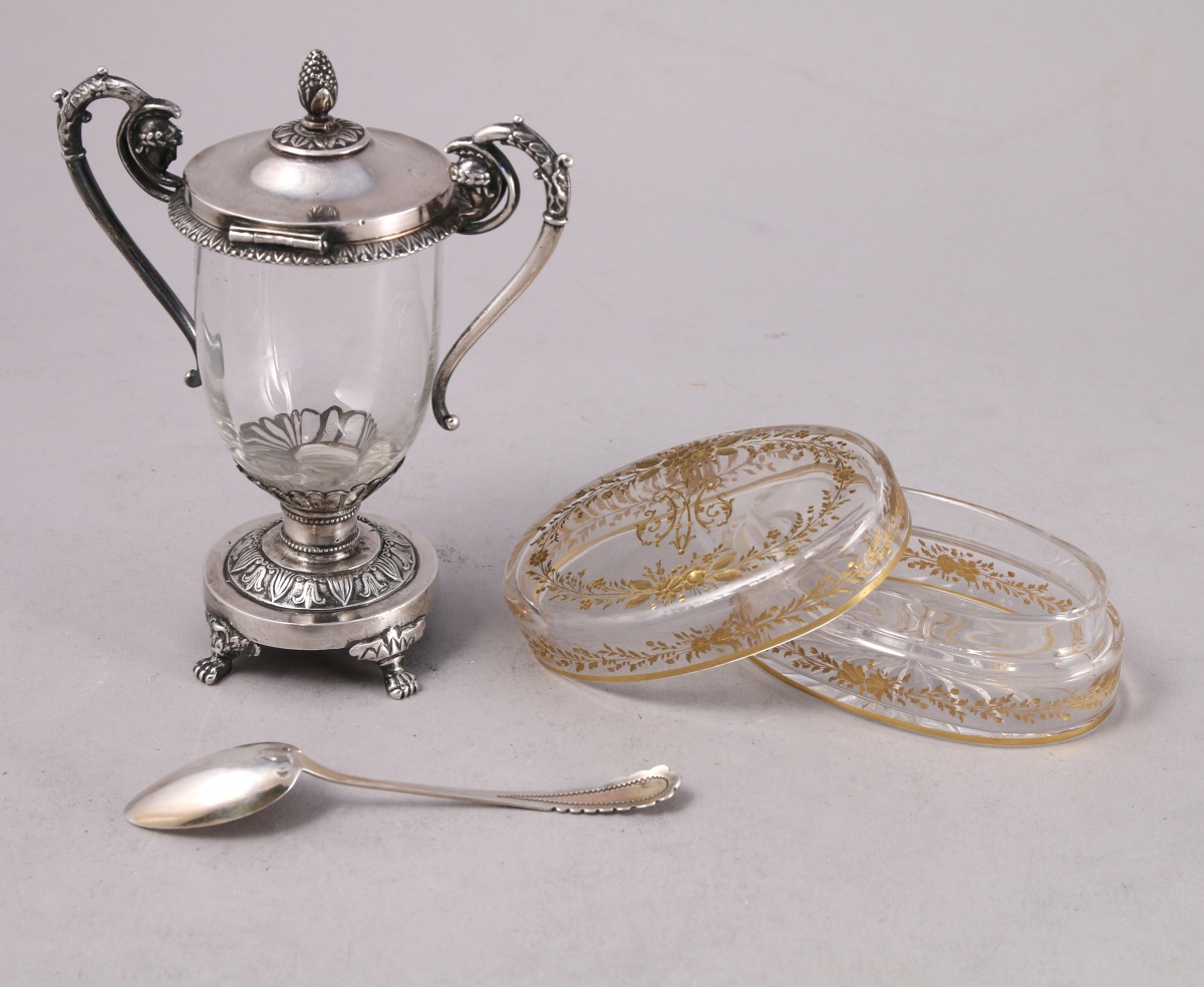 MOUTARDIER en argent de forme ovoïde, la prise en pomme de pin, avec deux anses à tête de Minerve casquée, reposant sur un fût et une base cylindrique ornée de feuilles de lotus sur quatre pieds griffes. Avec son récipient en verre taillé à pans et cerclé d'argent.