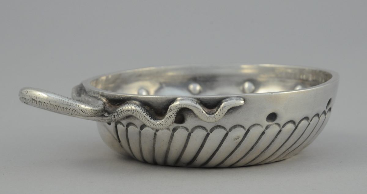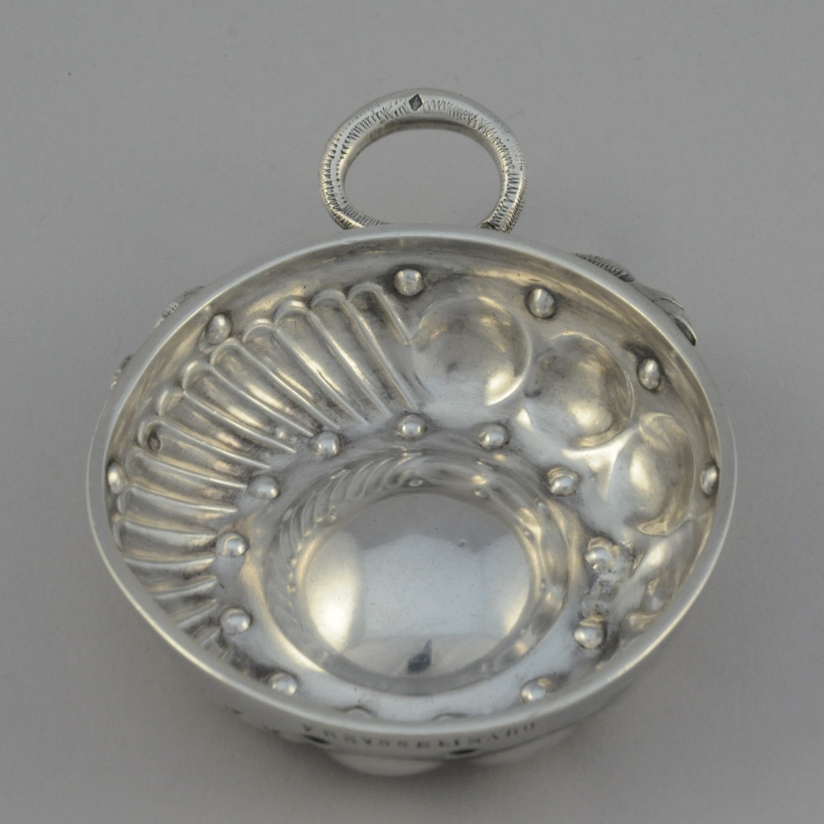 TASTEVIN en argent à décor de godrons, perles et cupules marqué "FREYSSELINARD". Anse serpentiforme ciselée d'écailles.