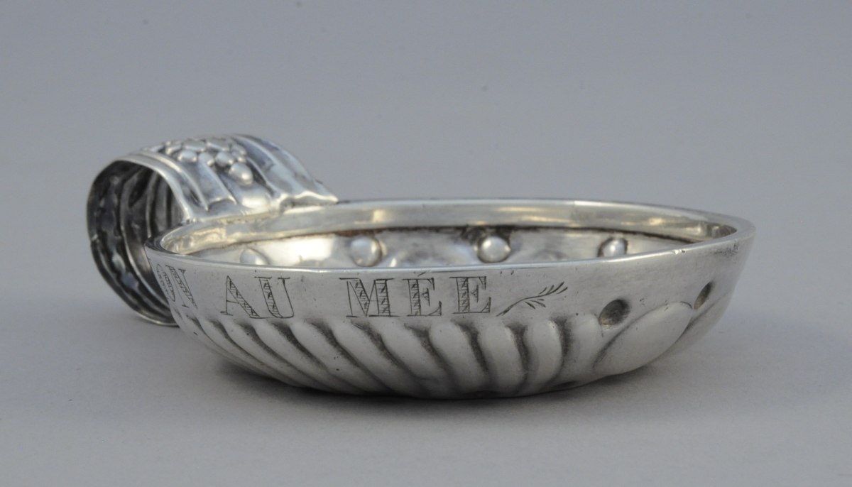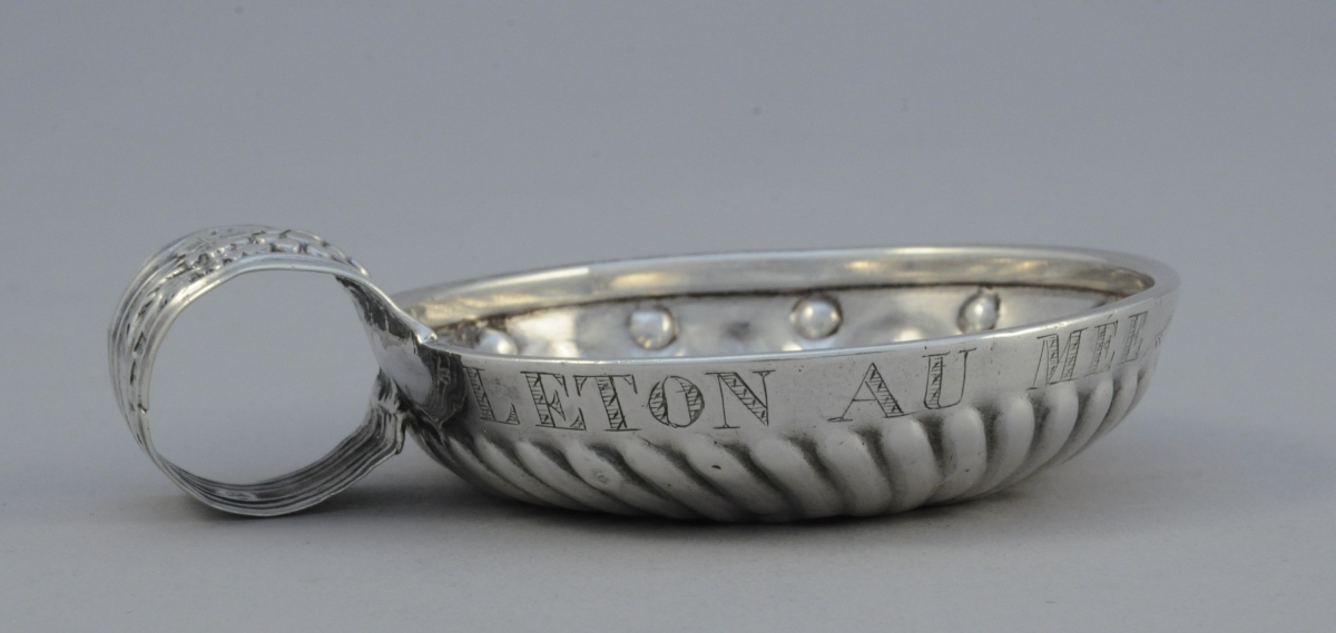 TASTEVIN en argent à décor de godrons, perles et cupules marqué "LETON AU MEE". Anse à enroulement cannelée ornée d'un pampre de vigne et marquée "LETON".
