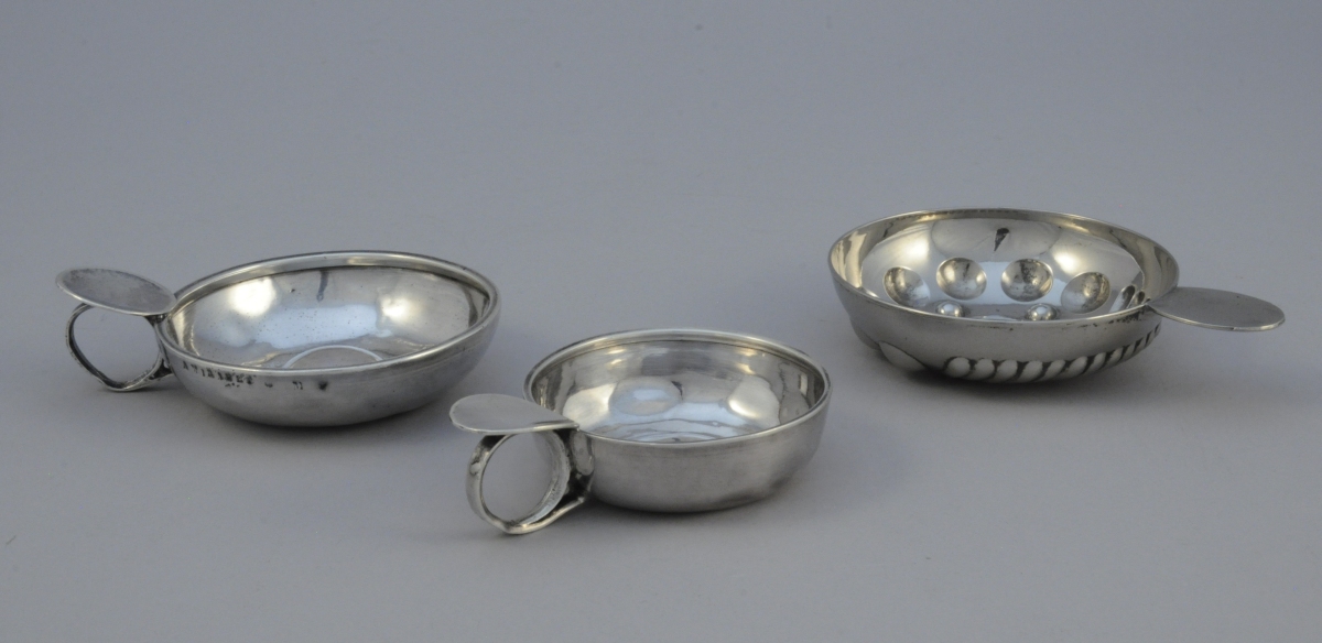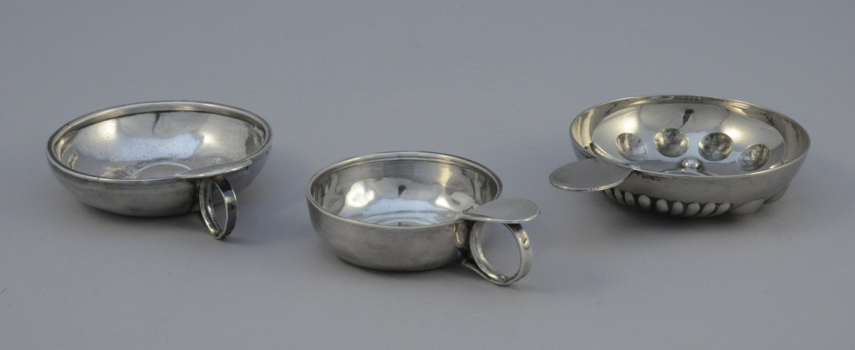 DEUX TASTEVINS en argent uni. Appui-pouce de forme ovale agrémenté d'une prise en anneau. Fond bombé.