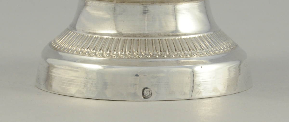 TIMBALE dite TULIPE en argent à décor circulaire d'une guirlande fleurie et feuillagée. Elle repose sur un piédouche orné d'une frise de feuilles d'eau.