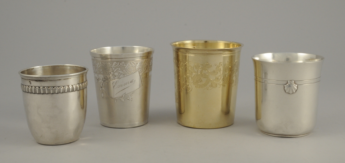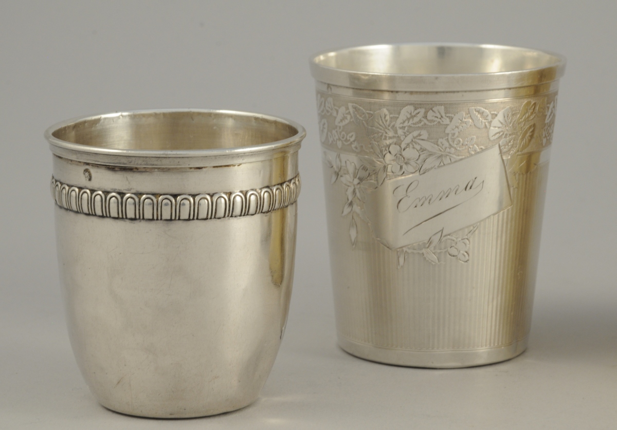 -La troisième de forme tronconique à décor de guillochis et d'une frise d'ipomées en partie supérieure. Cartouche recatangulaire gravé "Emma". Haut. 7,5, Diam. 6,5 cm. Poids : 69 g.