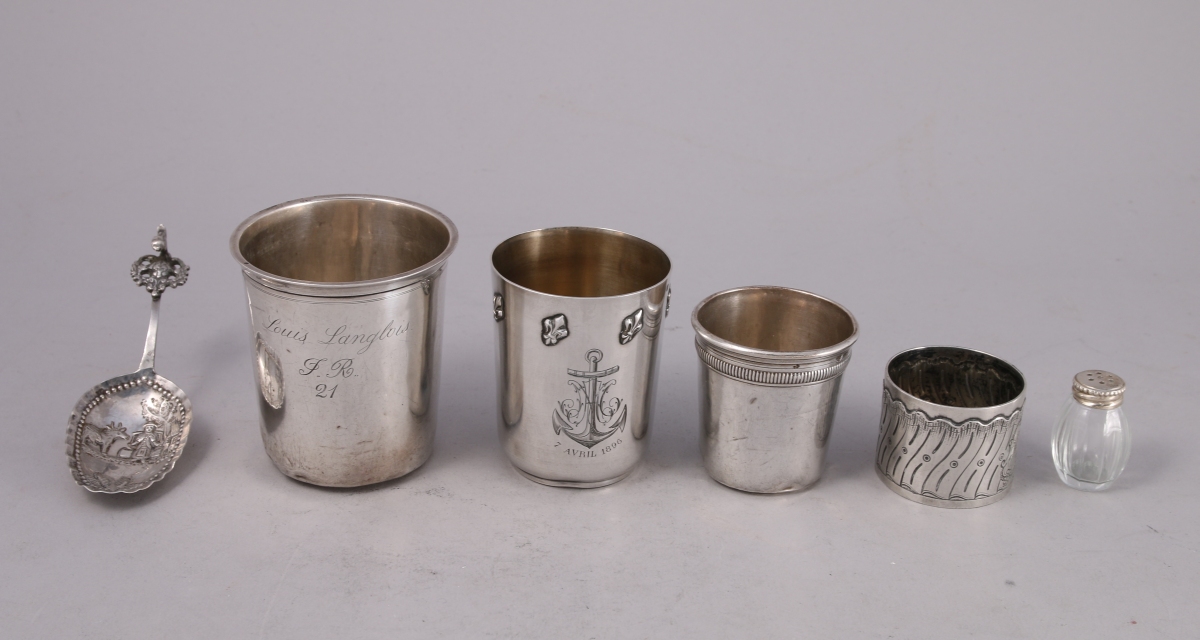 JOINT : rond de serviette style XVIIIe, petite salière verre couvercle argent, cuillère ancienne étrangère à la porteuse d'eau à la vache.