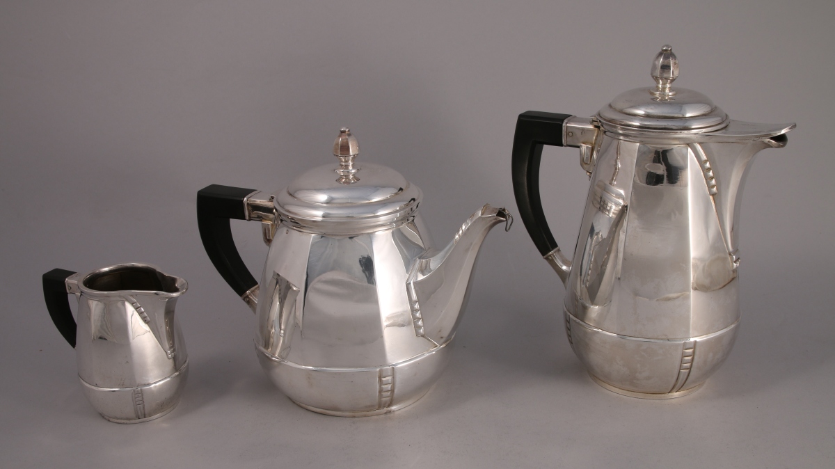 SERVICE à THÉ-CAFÉ en argent, 3 pièces, à pans coupés et côtes saillantes. Fretel en pomme de pin stylisée, manche en bois noirci. Il se compose d'une théïère, d'une cafetière et d'un pot-à-lait.
