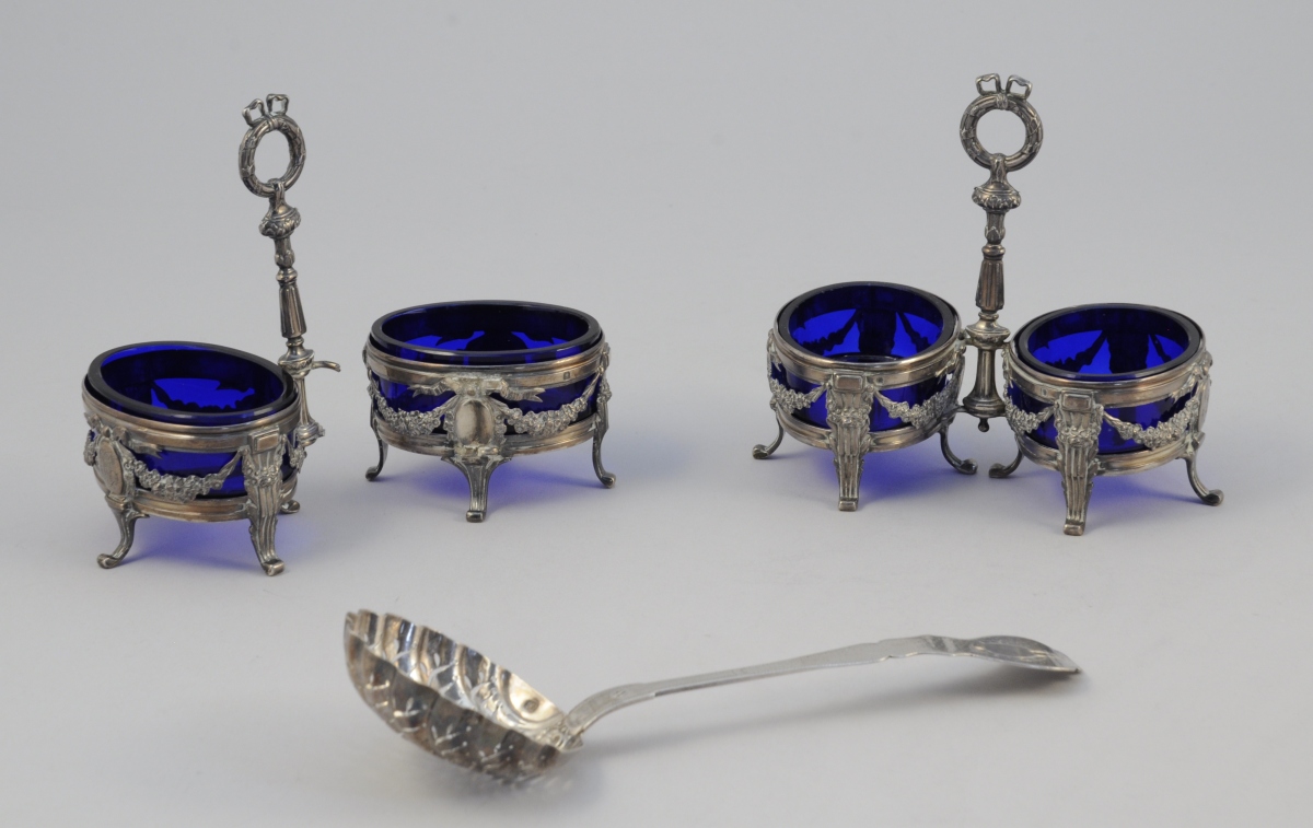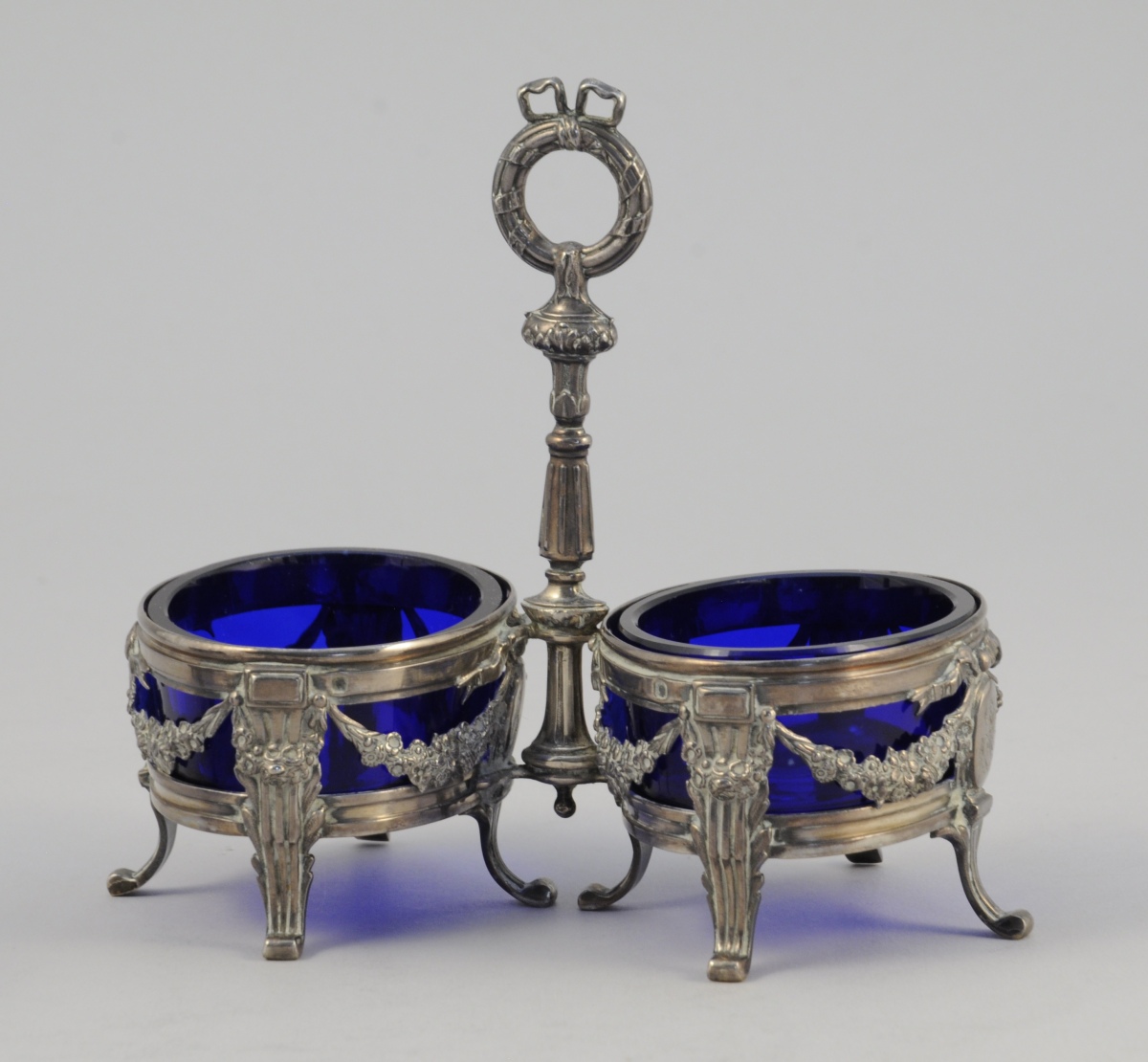 JOINT : Paire de SALERONS DOUBLES en argent de forme ovale monogrammés à décor ajouré de guirlandes et rubans reposant chacune sur quatre pieds cannelés et mouvementés. Garnis de trois receptacles en verre bleu.