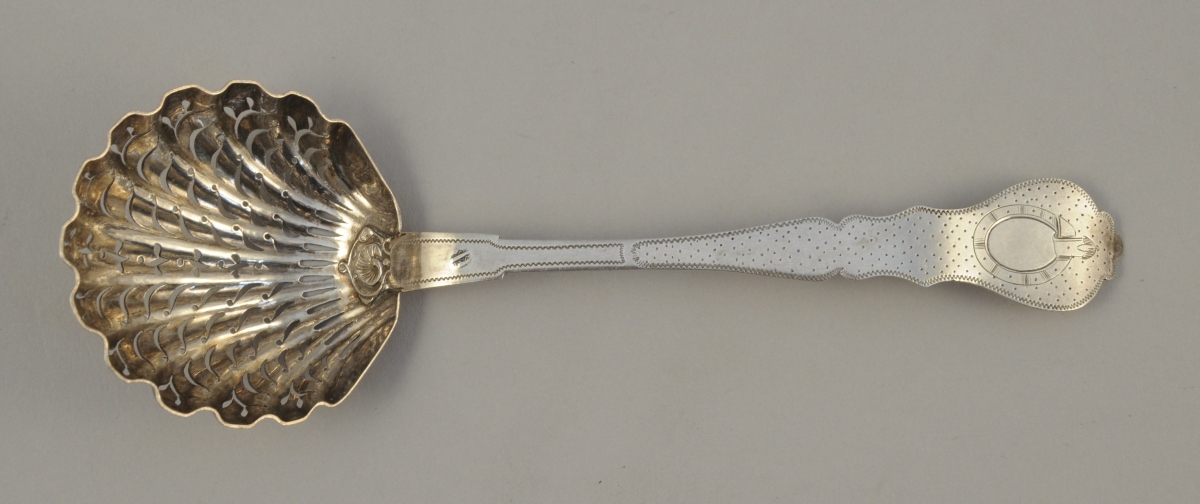 JOINT : CUILLÈRE À SUCRE en argent en forme de coquille ajourée, le manche gravé.