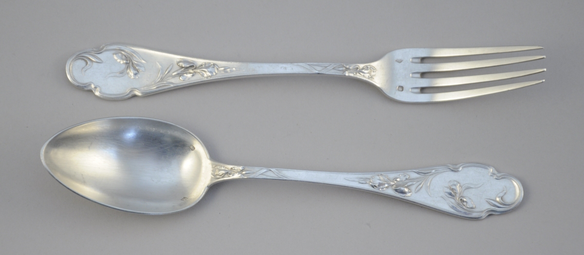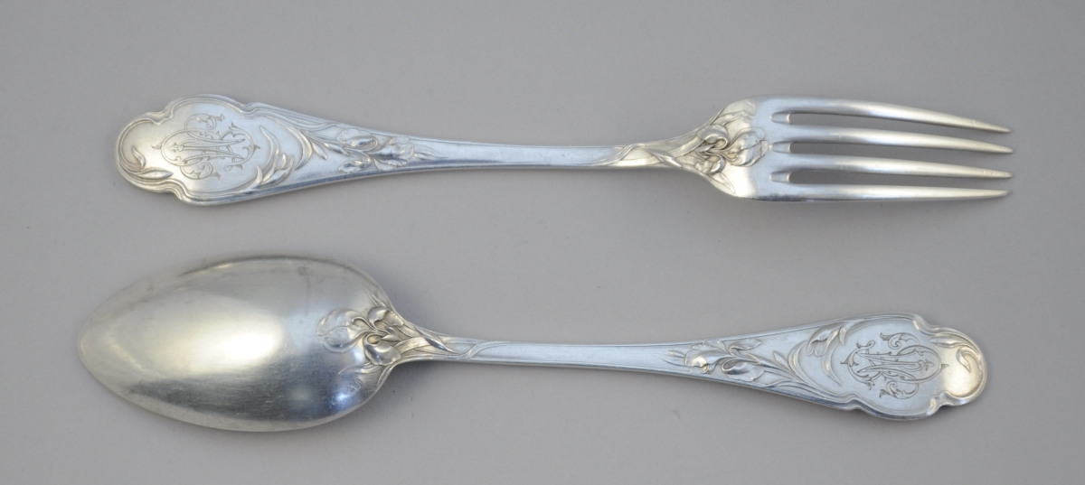 MÉNAGÈRE ART NOUVEAU en argent, 67 pièces à motifs d'iris monogrammées "MT". Elle se compose de 16 couverts de table, 16 couverts à entremets (manque une cuillère), une saupoudreuse ainsi qu'un couteau et une fourchette pour servir le poisson.