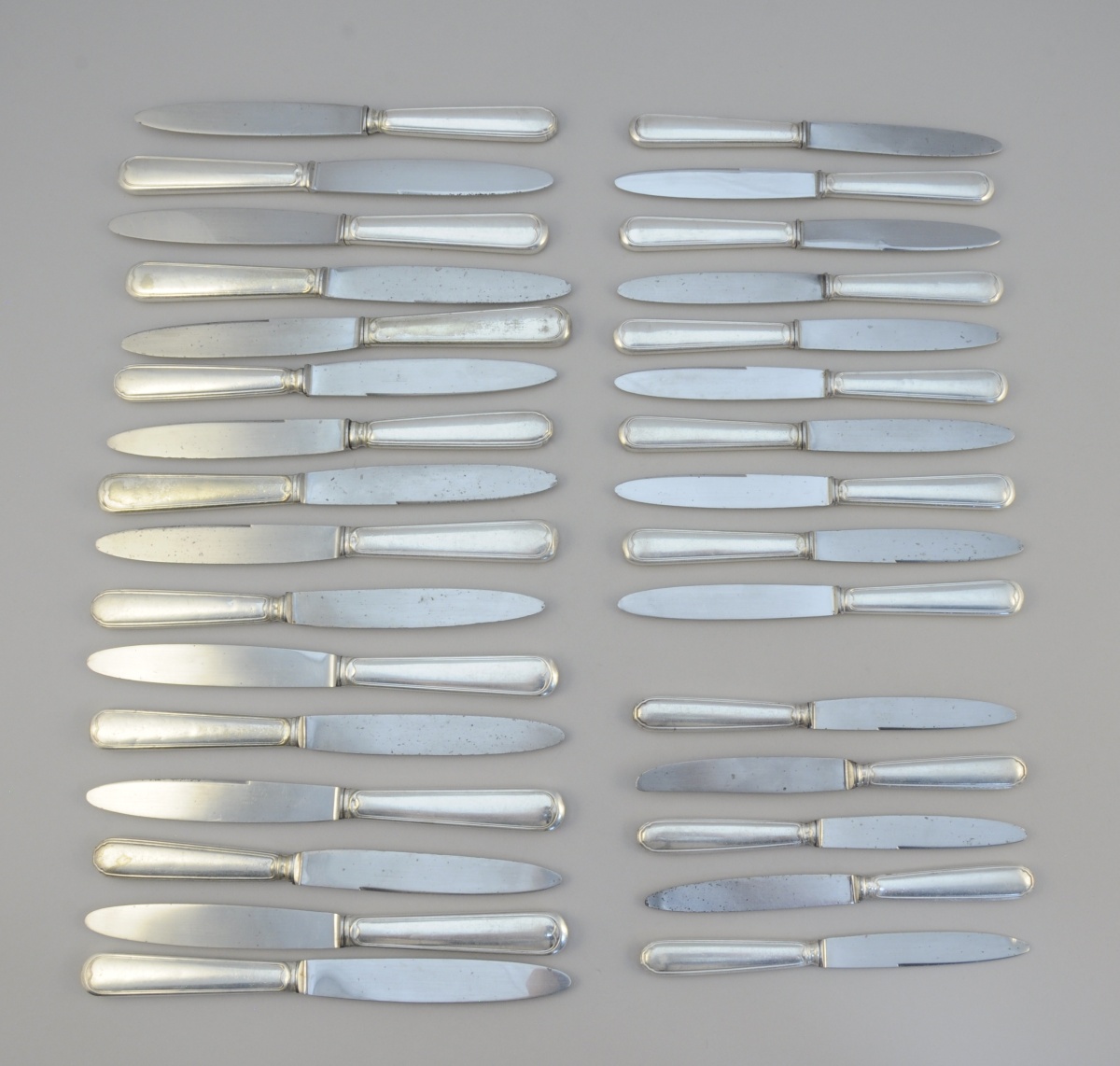 JOINT : 16 grands COUTEAUX et 15 petits COUTEAUX , manche en métal argenté filet contour, lame inox.