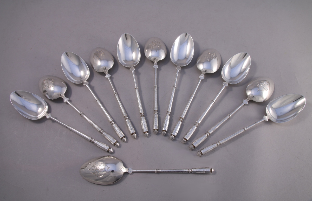 12 CUILLERES A ENTREMETS en argent, de style composite. Cuilleron gravé d'initiales.