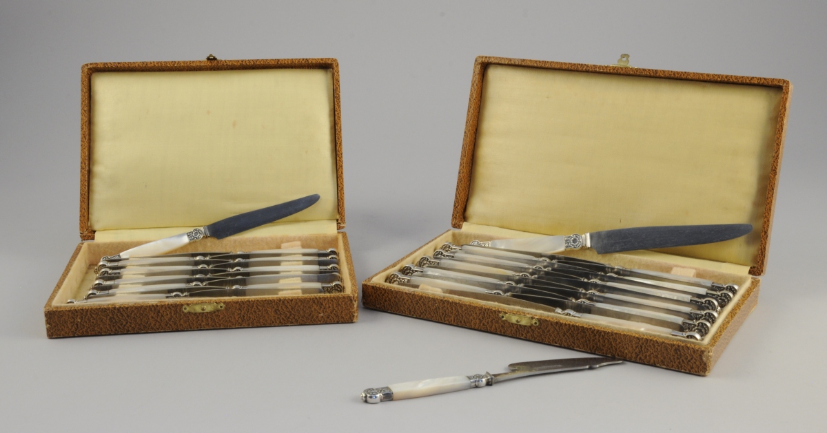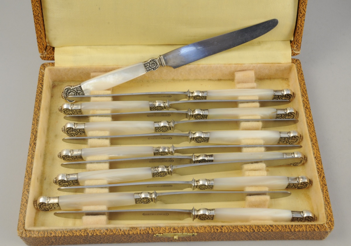 SUITE de COUTEAUX, 25 pièces, à manche en nacre. Virole et mitre en argent, à décor de rinceaux, feuillages, fleurons et masque féminin couronné de fleurs. Lame en acier marquée Chatellerault. Elle se compose de 12 COUTEAUX de TABLE, 12 COUTEAUX à ENTREMETS et un COUTEAU à FROMAGE.