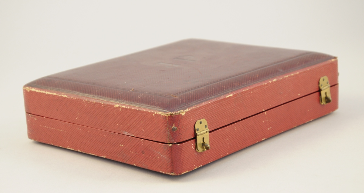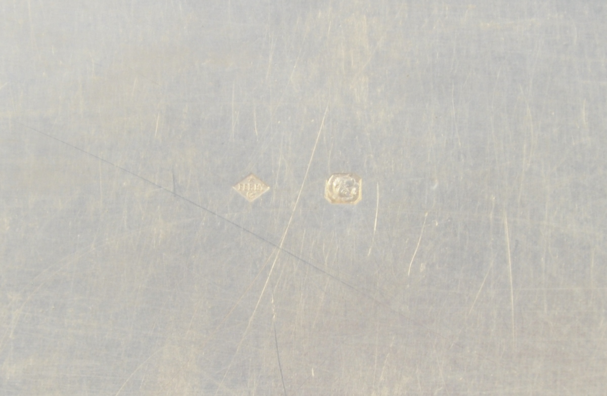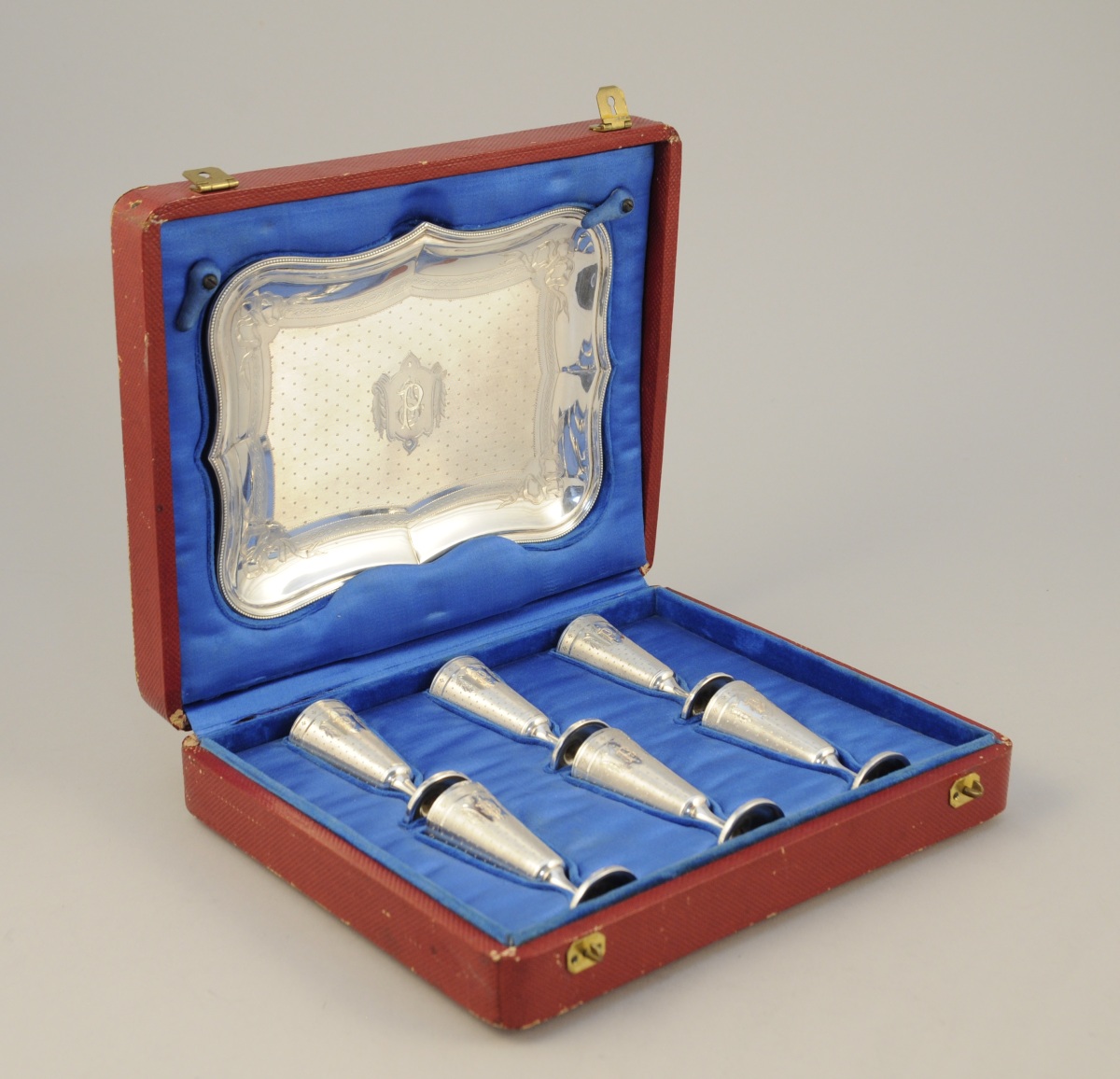 NÉCESSAIRE À LIQUEUR en argent monogrammé "JP". Il se compose d'un PLATEAU de forme rectangulaire à bordure mouvementée orné de rubans noués et guillochis et SIX FLÛTES À LIQUEUR ciselé d'un cartouche feuillagé sur fond guilloché.