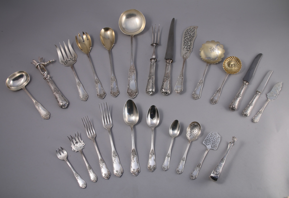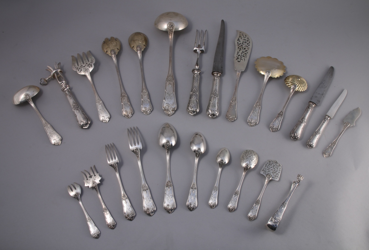 MÉNAGÈRE en argent, 124 pièces monogrammées "HP", modèle à contours mouvementés, à riche ornementation de feuillages et agrafes de style Louis XV. Elle se compose de 12 couverts de table; 12 couverts à entremets; 12 couteaux de table; 12 couteaux à entremets; 12 couteaux à fruits; 12 fourchettes à huîtres; 12 cuillères à café; 4 pièces de service à entremets (fourchette à sardines, cuillère à olives, pelle à thon et couteau à beurre); une pince à sucre, une saupoudreuse; une pelle à fraises; un couvert à salade; une louche; une cuillère à crème; une fourchette et un couteau de service à poisson; une fourchette à gigot; un couteau à trancher et un manche à gigot.