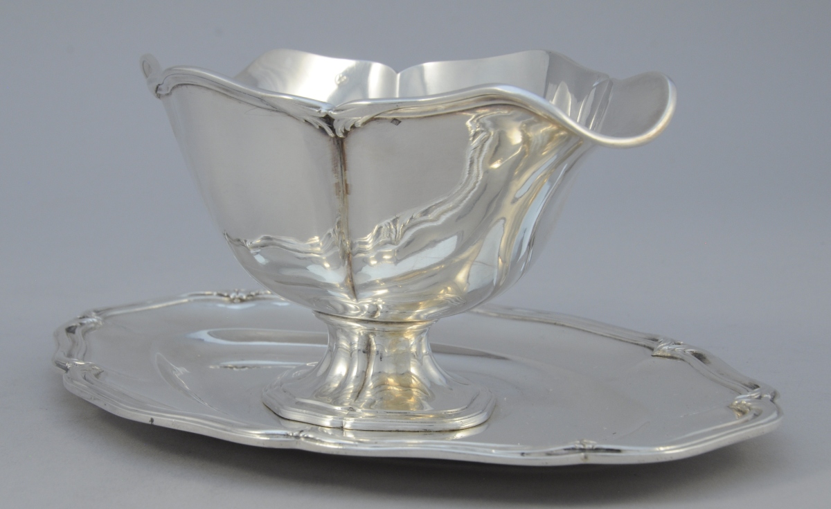 SAUCIÈRE et son plateau adhérent à bordures chantournées à batte contour agrémentées de feuillages stylisés de style Louis XV. La saucière ornée de côtes pincées repose sur un piédouche godroné.
