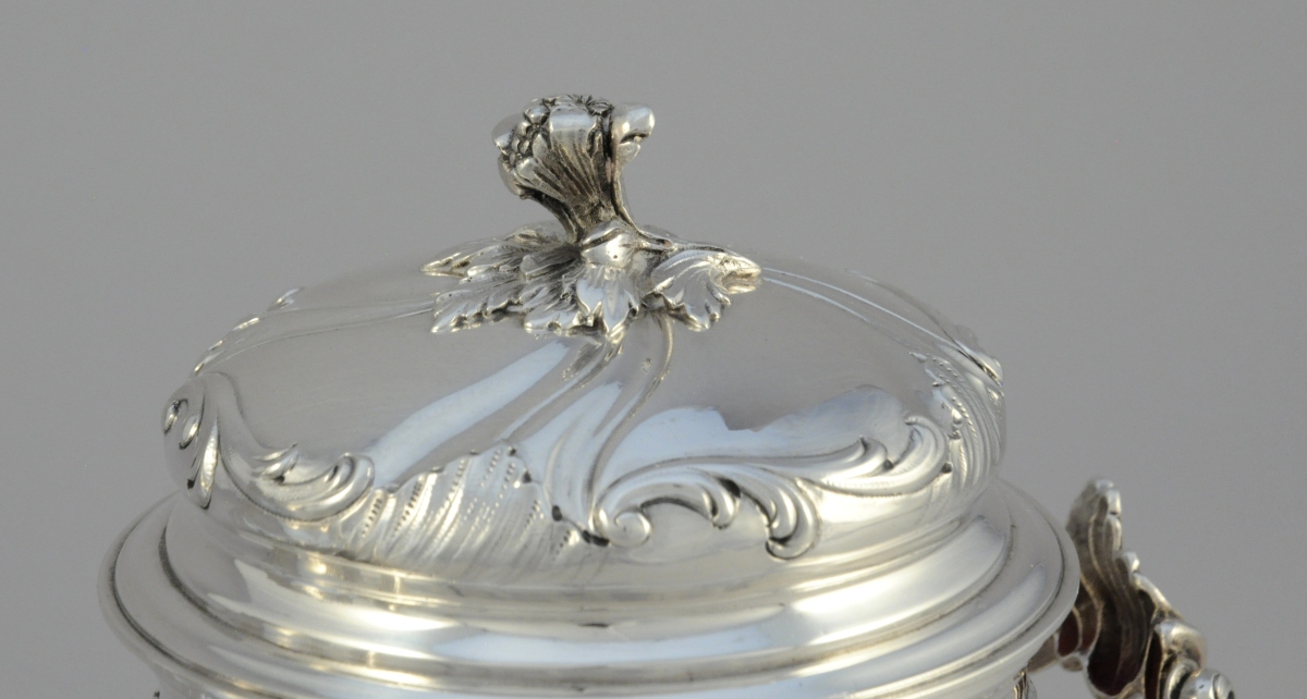 SERVICE À THÉ, 3 pièces, en argent à décor de côtes torses, volutes et feuillages stylisés. Il se compose d'une théière, d'un sucrier et d'un pot-à-lait. Fretel figurant un bouquet de fleurs reposant sur une feuille. Piètement quadripode à enroulement à attache feuillagée. La théière baguée d'ivoire. Monogramme "HP" sous la panse.