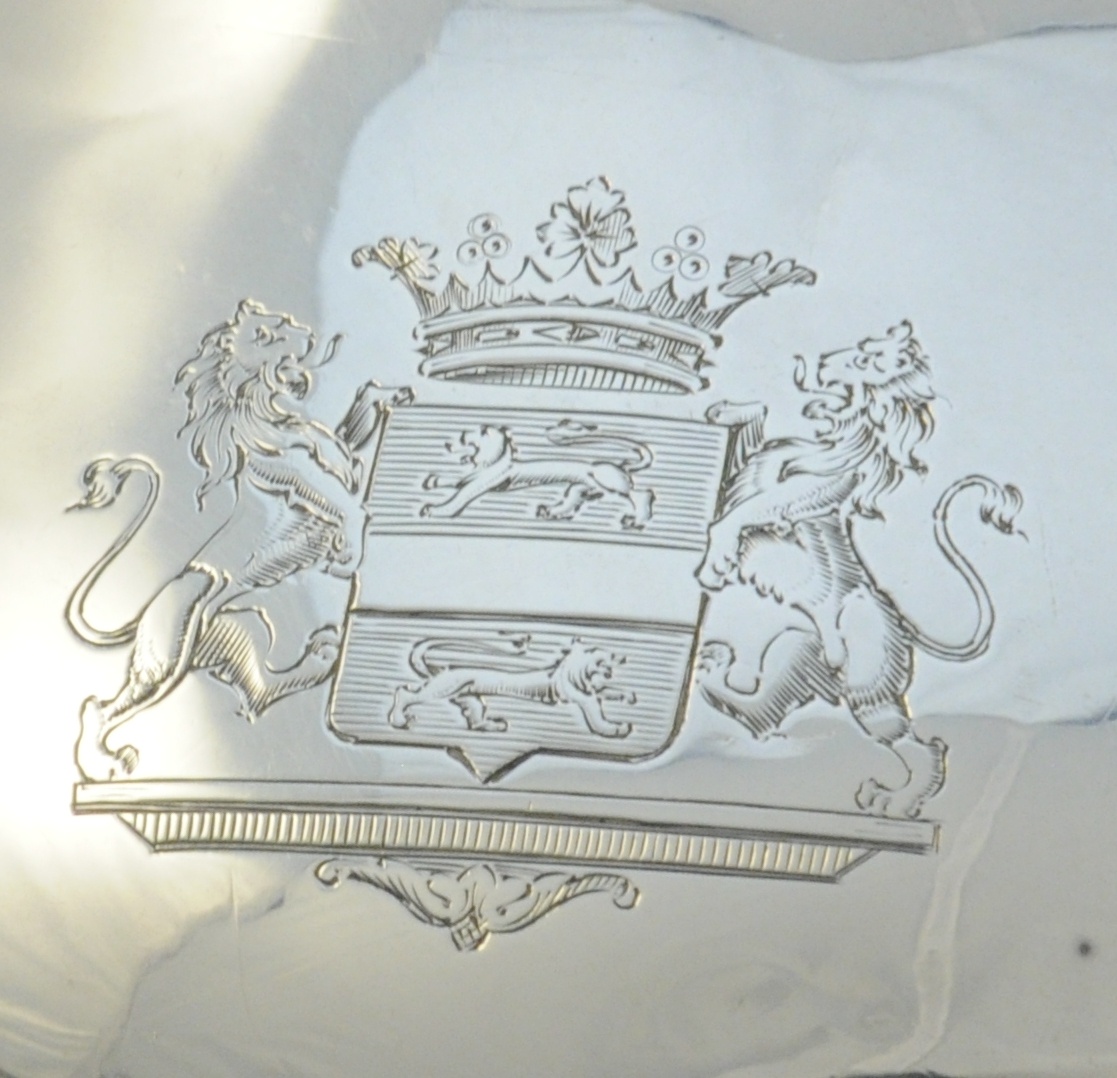 -VERSEUSE ÉGOÏSTE à panse basse aux armes de la famille de Chefdebien Zagarriga timbrées d'une couronne de marquis et soutenues par des lions. Le bec verseur dit "canard". Anse en bois noirci. Le fretel en toupie.