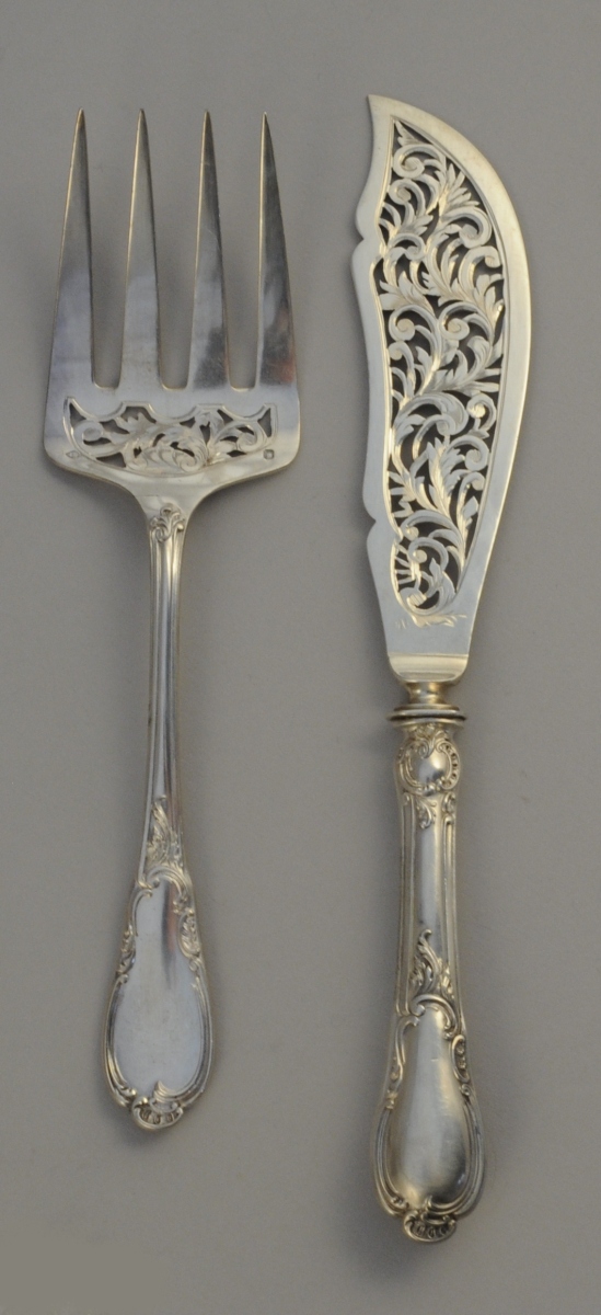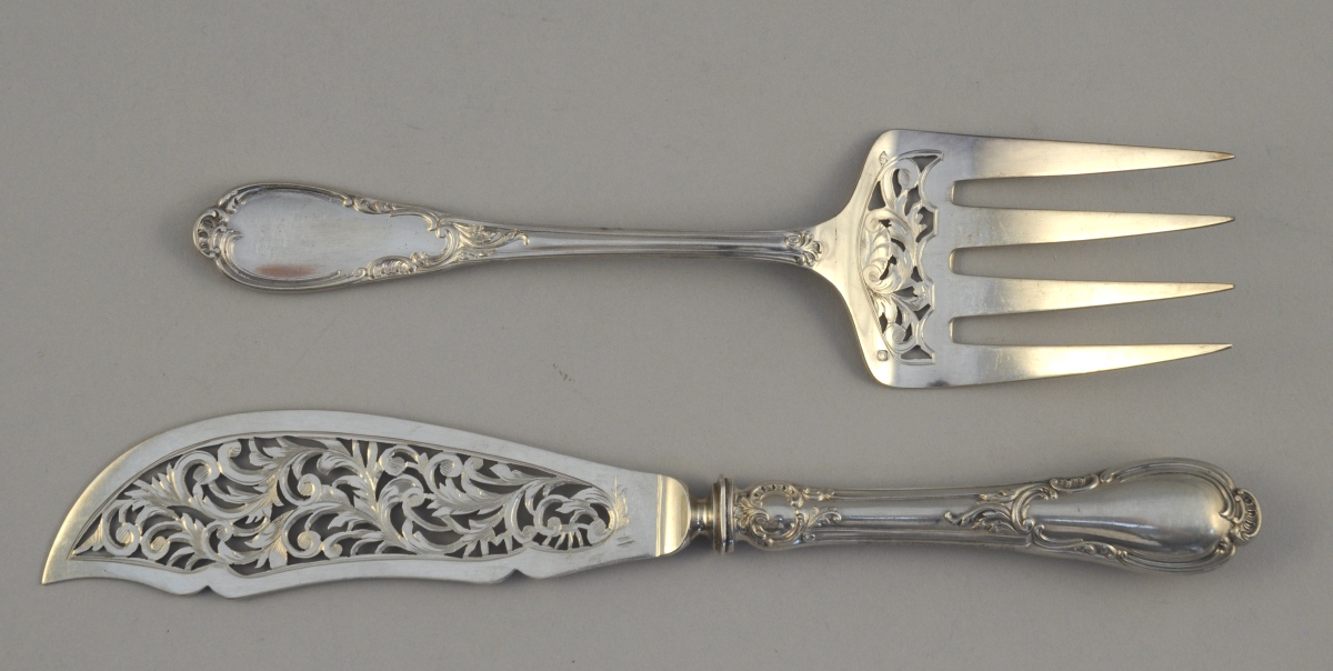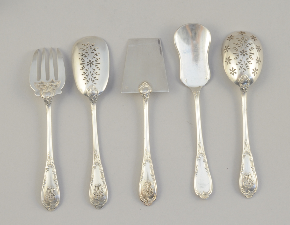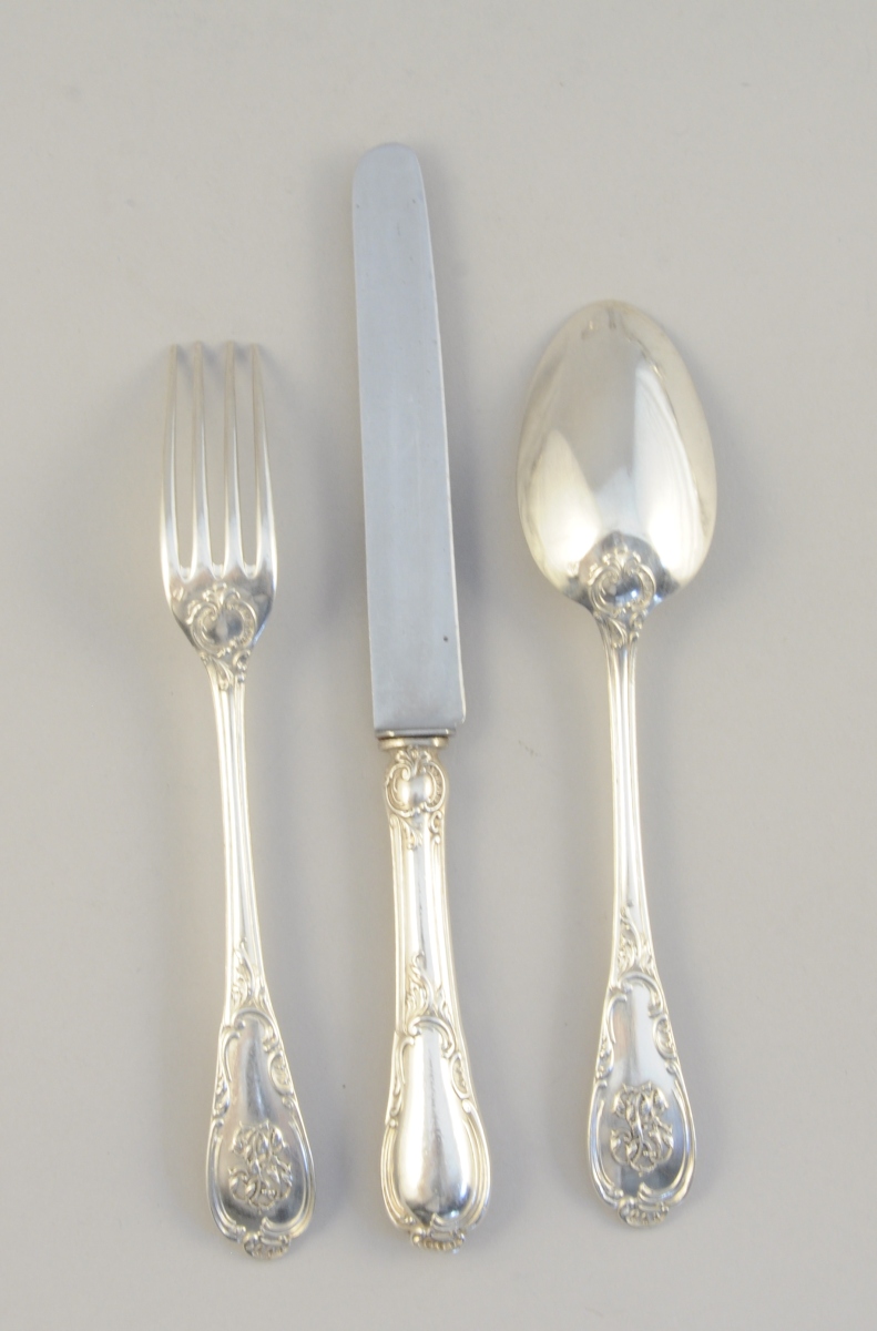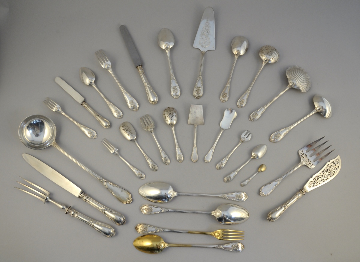 Importante MÉNAGÈRE en argent, 210 pièces, à décor rocaille d'acanthe stylisées et volutes feuillagées. Monogramme "BP" appliqué ou gravé. Elle se compose de 24 couverts de table, 12 fourchettes de table, 24 couteaux de table, 24 couverts à entremets, 22 couteaux à entremets, 20 cuillères à café, 12 fourchettes à huîtres, 4 pelles à sel à cuillerons en vermeil, un couvert à salade à cuillerons en vermeil, deux cuillères à ragoût, une louche, une cuillère à sauce, une cuillère à crème, une fourchette et un couteau de service à poisson, une fourchette et un couteau à découper, une pelle à tarte, une pelle à fraises, une cuillère saupoudreuse et un service à hors d'oeuvres de 6 pièces.