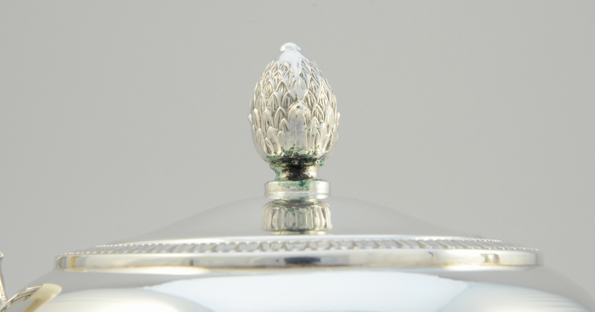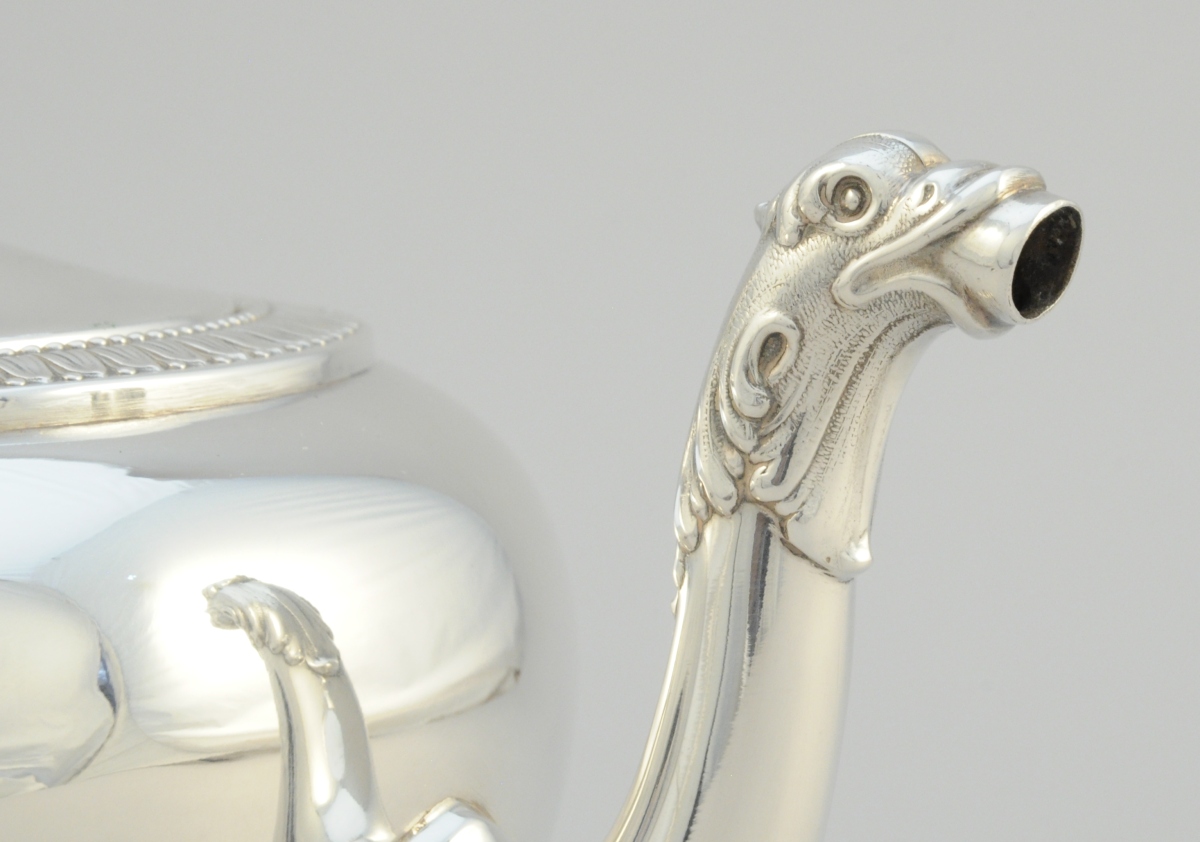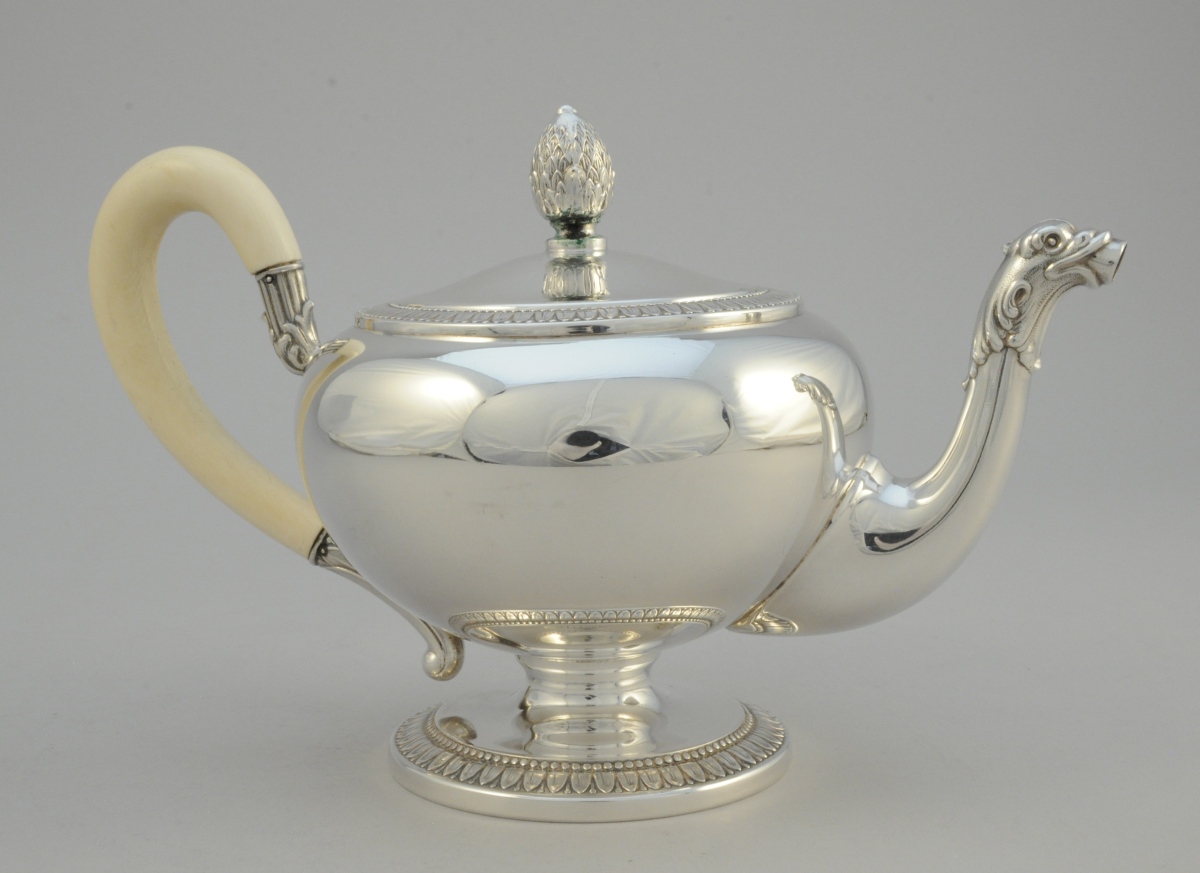 VERSEUSE sur piédouche en argent ciselé de frises de feuilles d'eau et rais de perles. Le bec figurant une tête d'oiseau. Le fretel en forme de graine. Anse courbe en ivoire à attaches feuillagées.