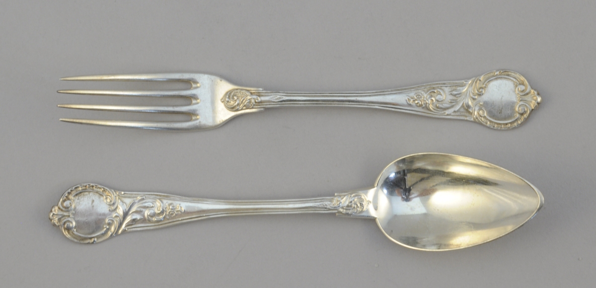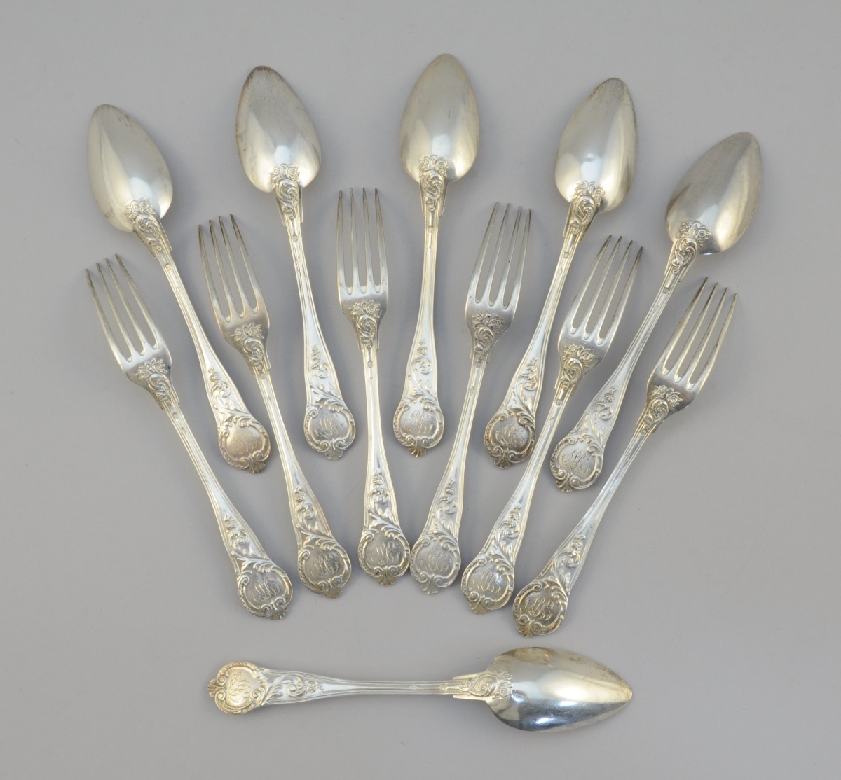 Suite de 6 COUVERTS À ENTREMETS en argent. Cuilleron violonné à motifs feuillagés monogrammé "LLC".