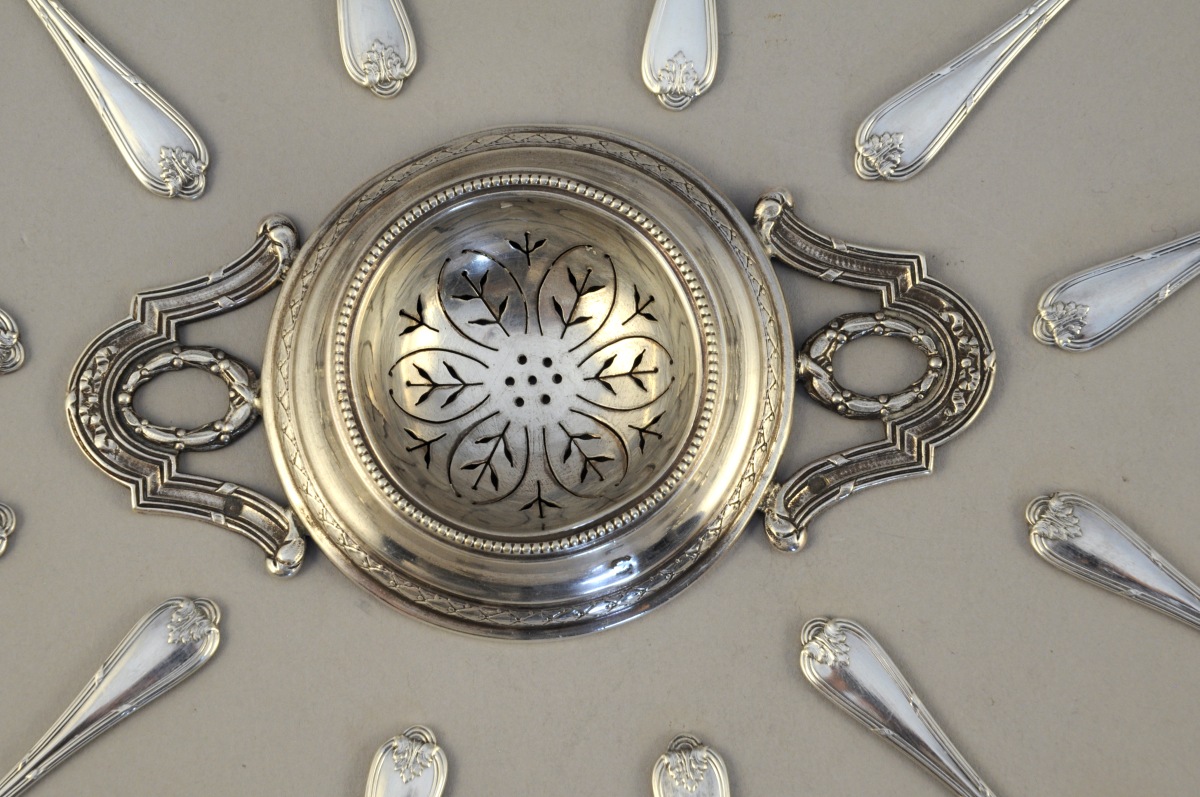 JOINT : PASSE-THÉ de forme circulaire orné d'un tore de laurier. Anses latérales à décor de joncs rubannés, couronne de laurier et ruban noué.