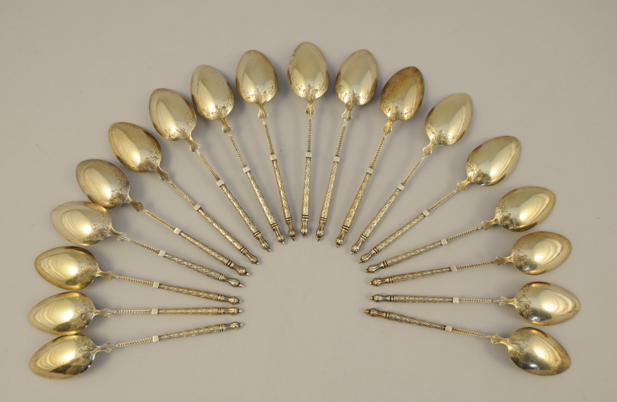 CARDEILHAC. Suite de 18 CUILLÈRES À MOKA, en vermeil. Manche "à la russe" et cuilleron à décor de guillochis et feuillages stylisés.