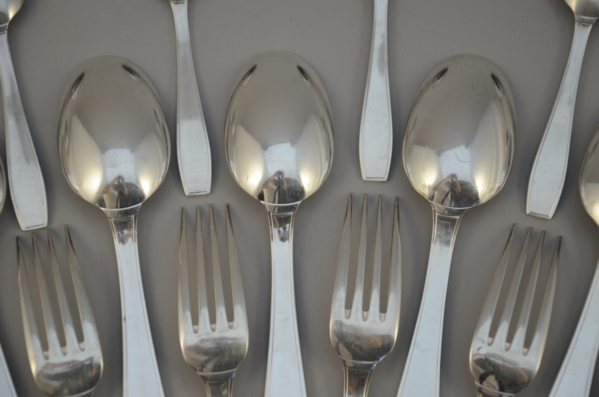 CHRISTOFLE. MÉNAGÈRE en argent, 36 pièces, modèle filet-contour à arrête médiane. Elle se compose de 12 couverts de table et 12 cuillères à café.