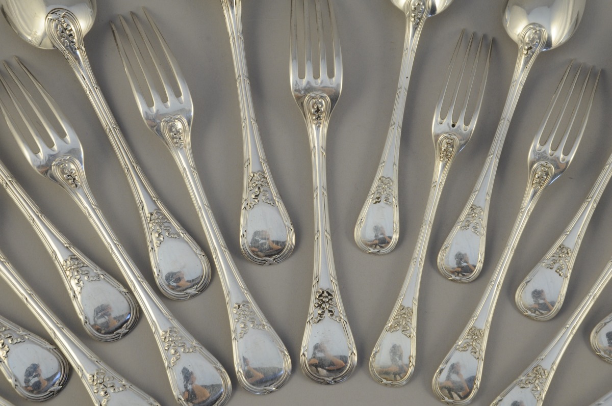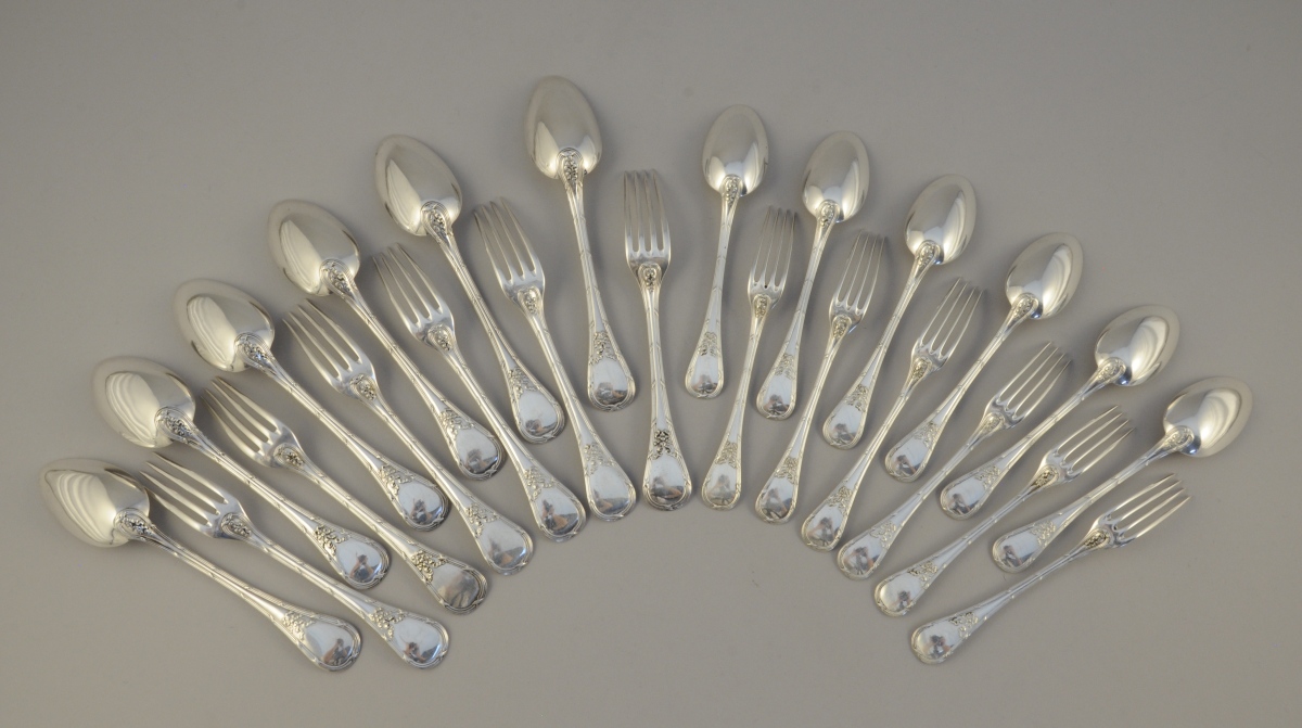 PUIFORCAT. MÉNAGÈRE en argent, 24 pièces, à décor de joncs rubanés et rubans noués. Elle se compose de 6 couverts de table et 6 couverts à entremets.