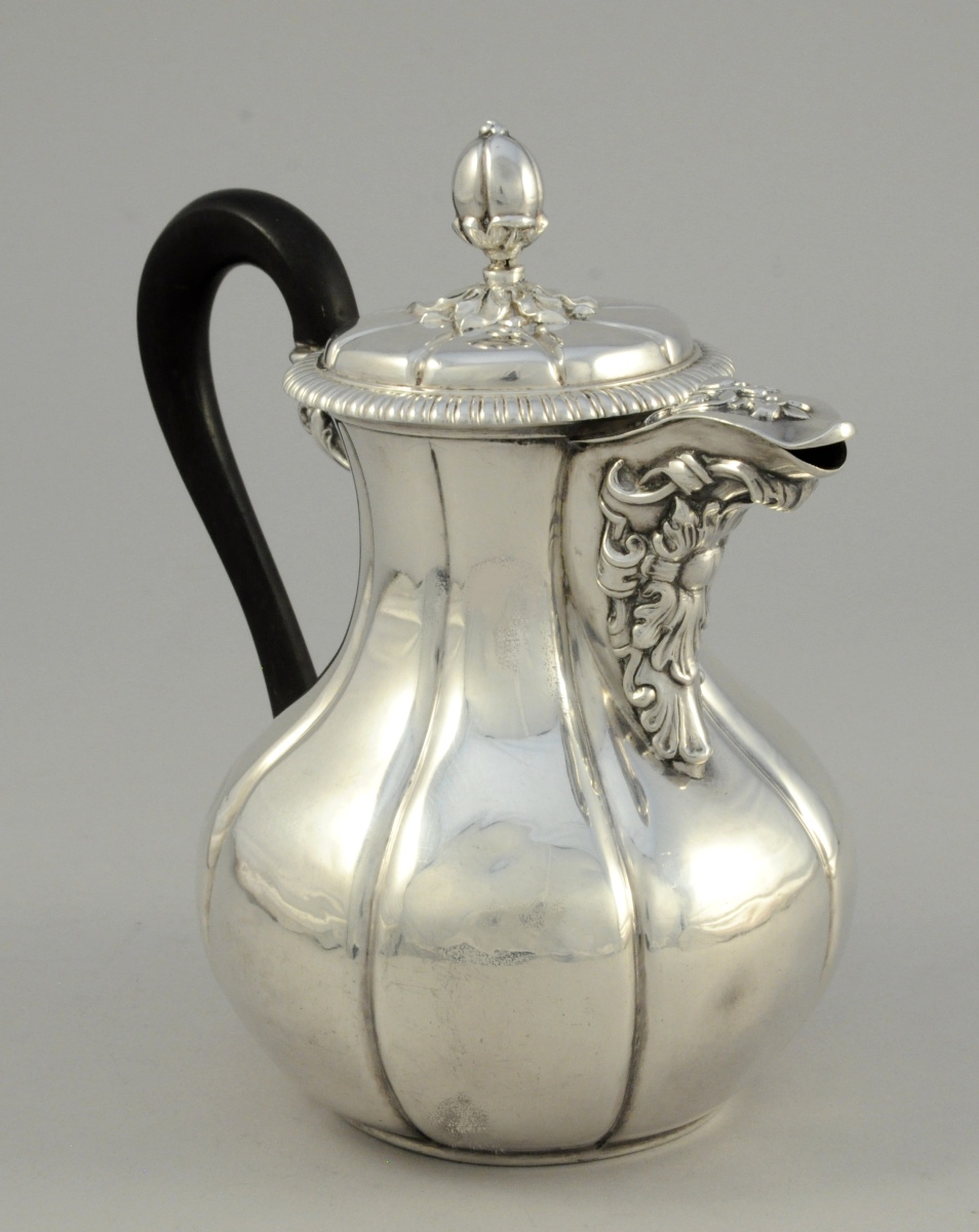 VERSEUSE en argent à panse renflée à côtes de melon. Le bec orné d'un large fleuron inscrit dans un cartouche feuillagé. Le fretel en forme de graine sur une terasse de feuilles de chêne. Anse en bois noirci à attaches feuillagées.