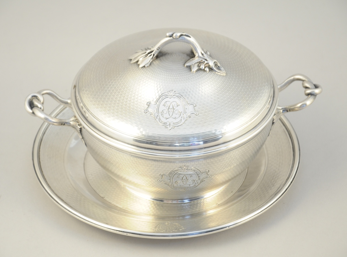 BOUILLON couvert et son PLATEAU en argent à décor de guillochis. Anses latérales nouées et frétel figurant une branche feuillagée. Monogramme "JC" dans un cartouche feuillagé.