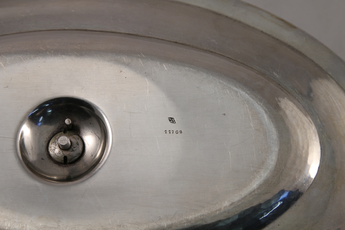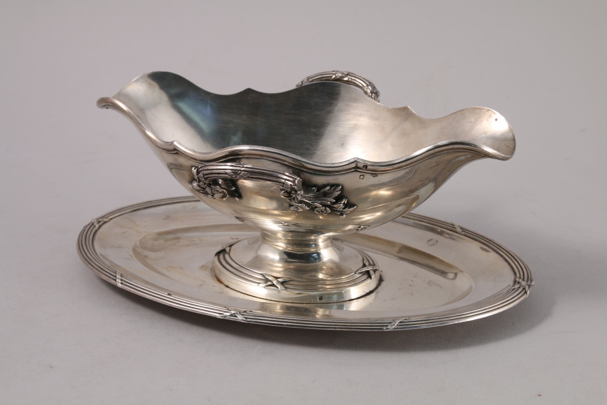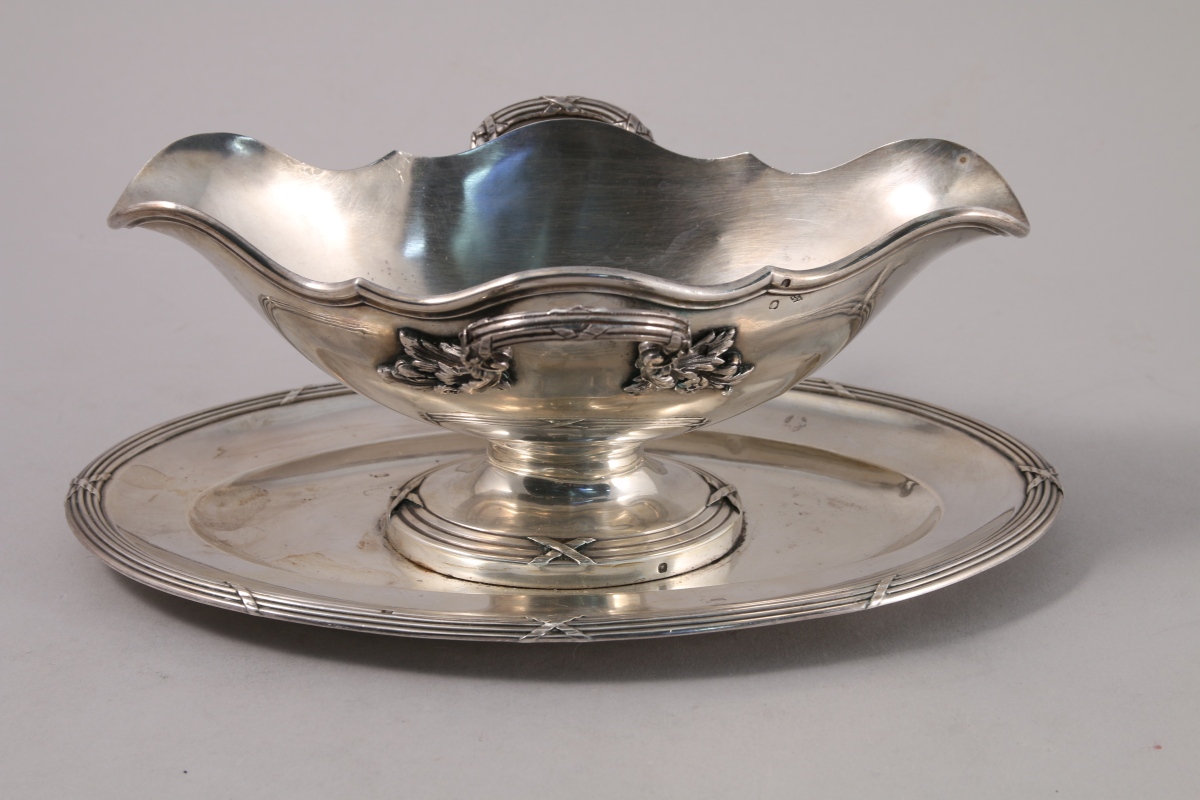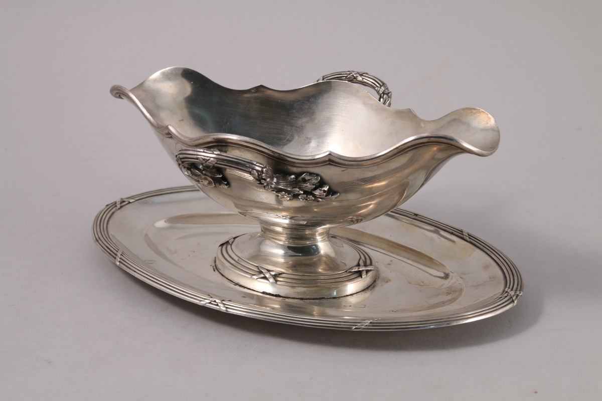SAUCIERE SUR PLATEAU en argent de style Louis XVI, à tore de ruban noué, et prises en agrafes feuillagées fleuries.