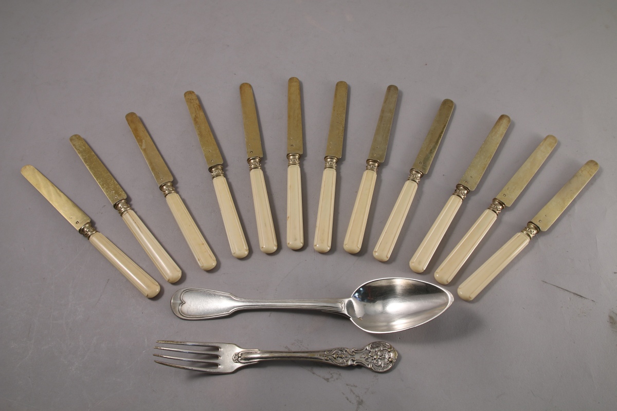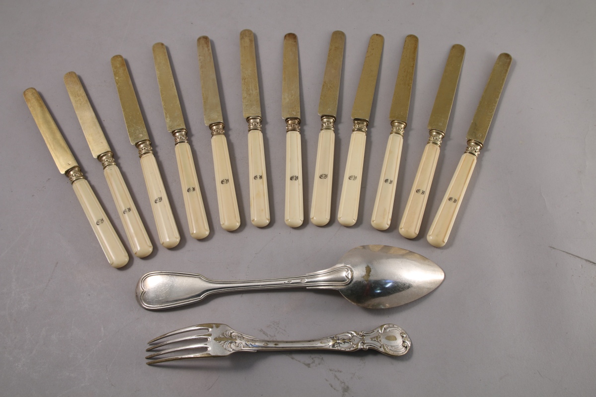 12 COUTEAUX A FRUITS. Manche ivoire-os ? avec initiales, lame vermeil. Poinçon Minerve.