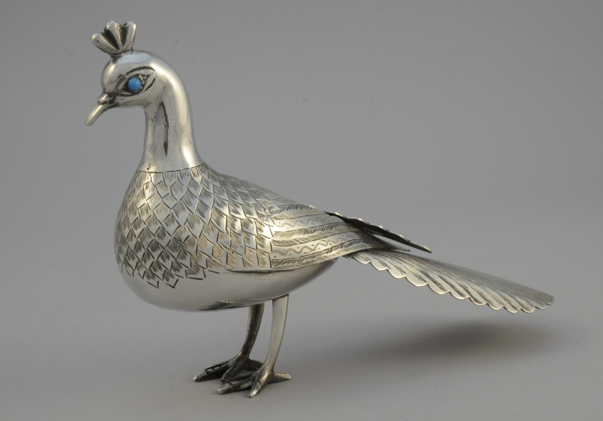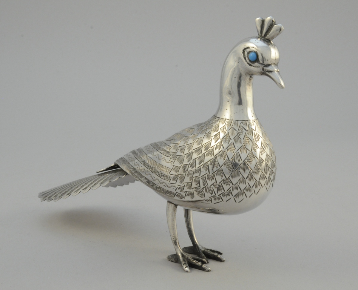 PAON en argent. Le dos gravé à l'imitation de plumes. Les yeux incrustés de verre turquoise.