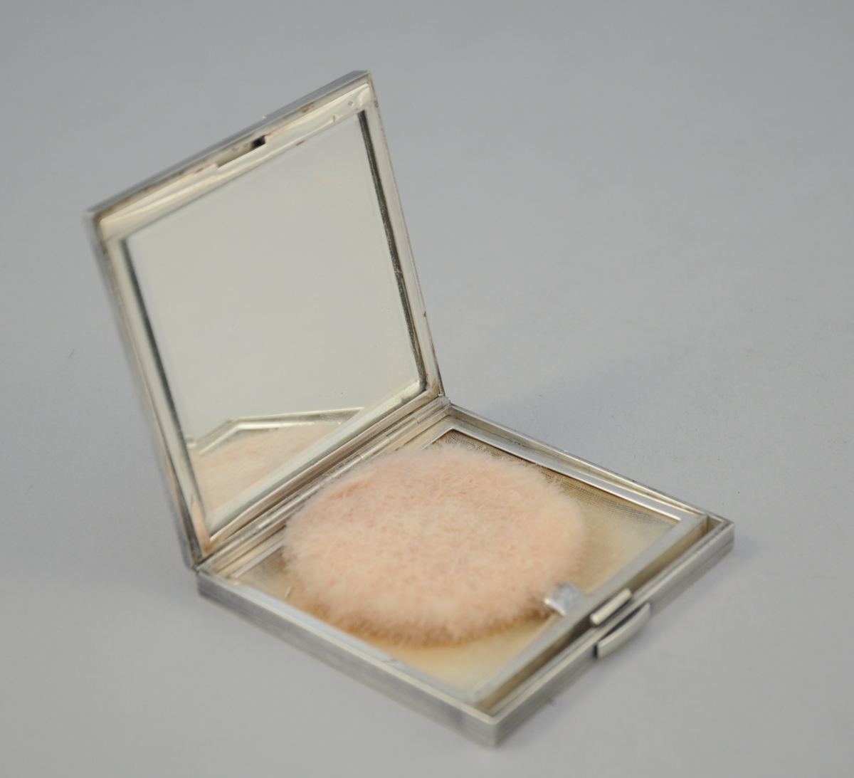 POUDRIER de forme carrée en argent à décor géométrique de stries et de pointes de diamant. Le coin inférieur droit du couvercle agrémenté d'une plaque de forme carrée en vermeil monogrammée "NG". L'intérieur foncé d'un miroir.
