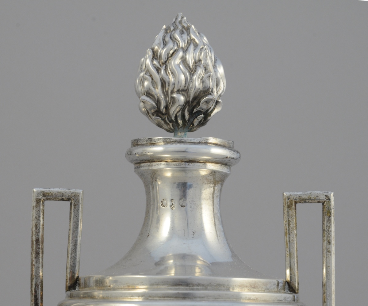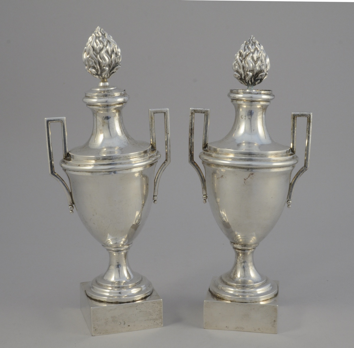 PAIRE DE POTS-À-FEU de forme balustre en argent. Le col étranglé reçoit une flamme amovible. Anses géométrisantes. Reposent sur un piédouche et une base carrée.
