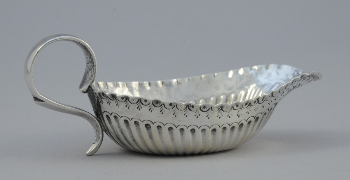 TASTEVIN à bec verseur de forme navette en argent orné de cannelures et frises de guirlandes feuillagées stylisées.