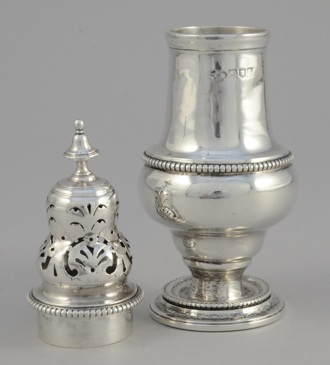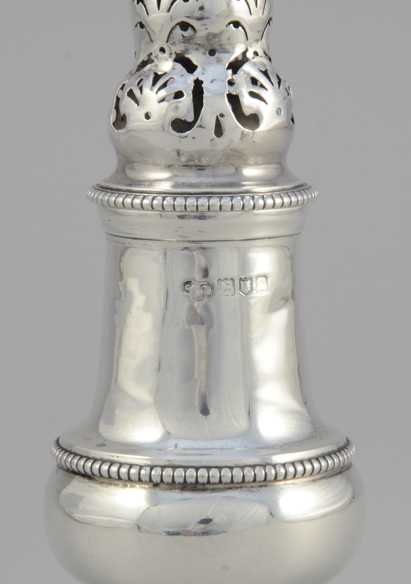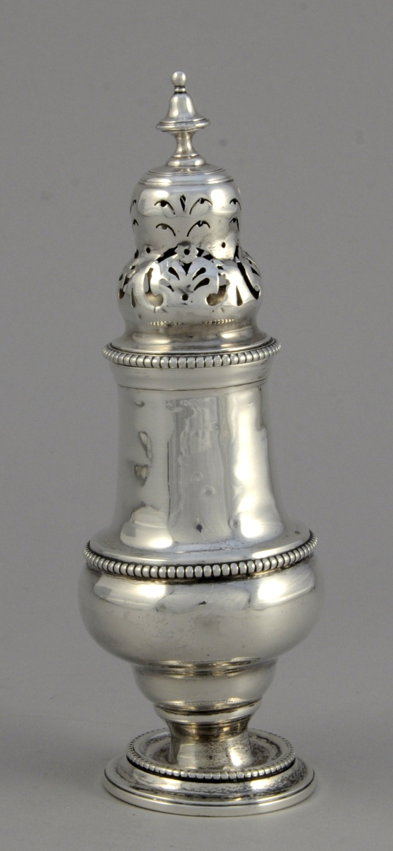 SAUPOUDREUSE de forme balustre en argent ornée de rais de perles. Le couvercle ajouré de coquilles stylisées. Fretel en toupie. Repose sur un piédouche.