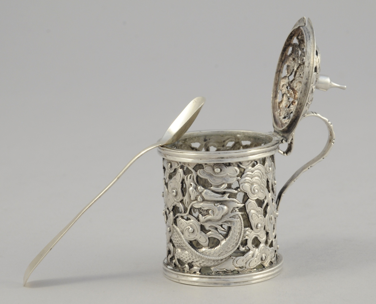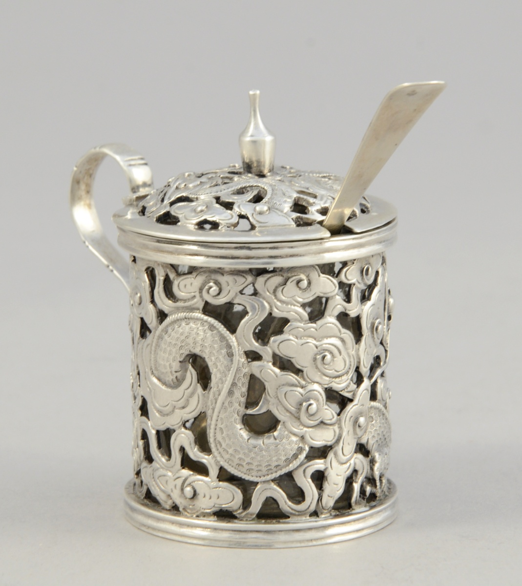 MOUTARDIER en argent ciselé et ajouré de dragon chassant la perle sacrée dans les nuages. Anse. Godet en verre.
