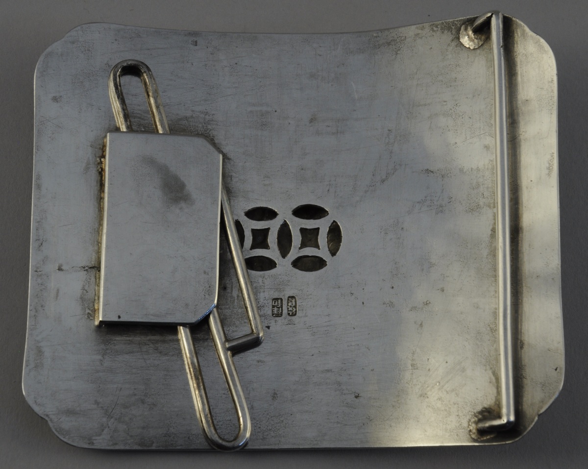 LARGE BOUCLE DE CEINTURE en argent à décor de chiens de Fô et motifs floraux.