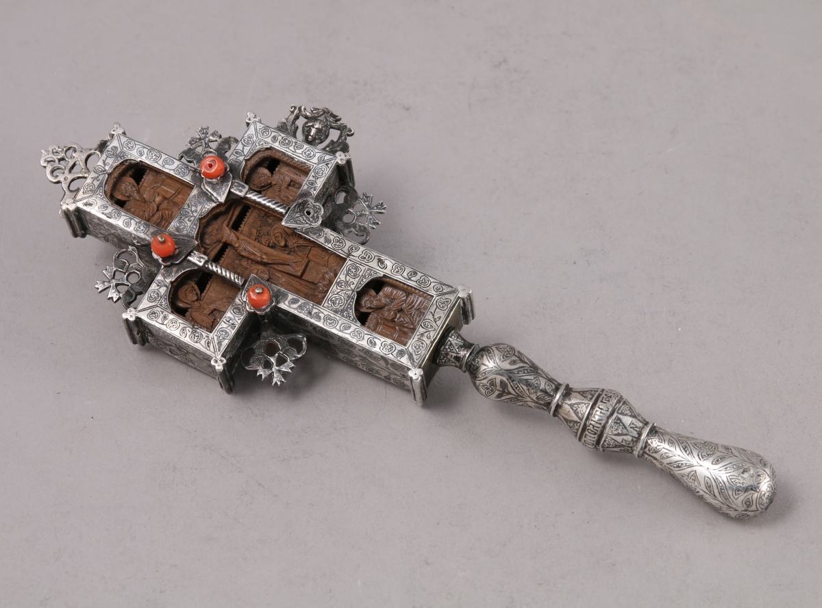 BAISER DE PAIX cruciforme en argent niellé à décor de frises feuillagées. La croix contient des bas-reliefs en corozo (?) sculpté figurant, en partie centrale, la Crucifiction d'un côté et la Descente de Croix de l'autre. Ces deux scènes principales encadrées de quatre représentations de saints. La croix est agrémentée de perles de corail (?) facettées et de motifs ajourés en partie supérieure, en écoinçons et d'un tête d'ange sur un côté. Manche balustre portant une inscription circulaire en cyrillique.