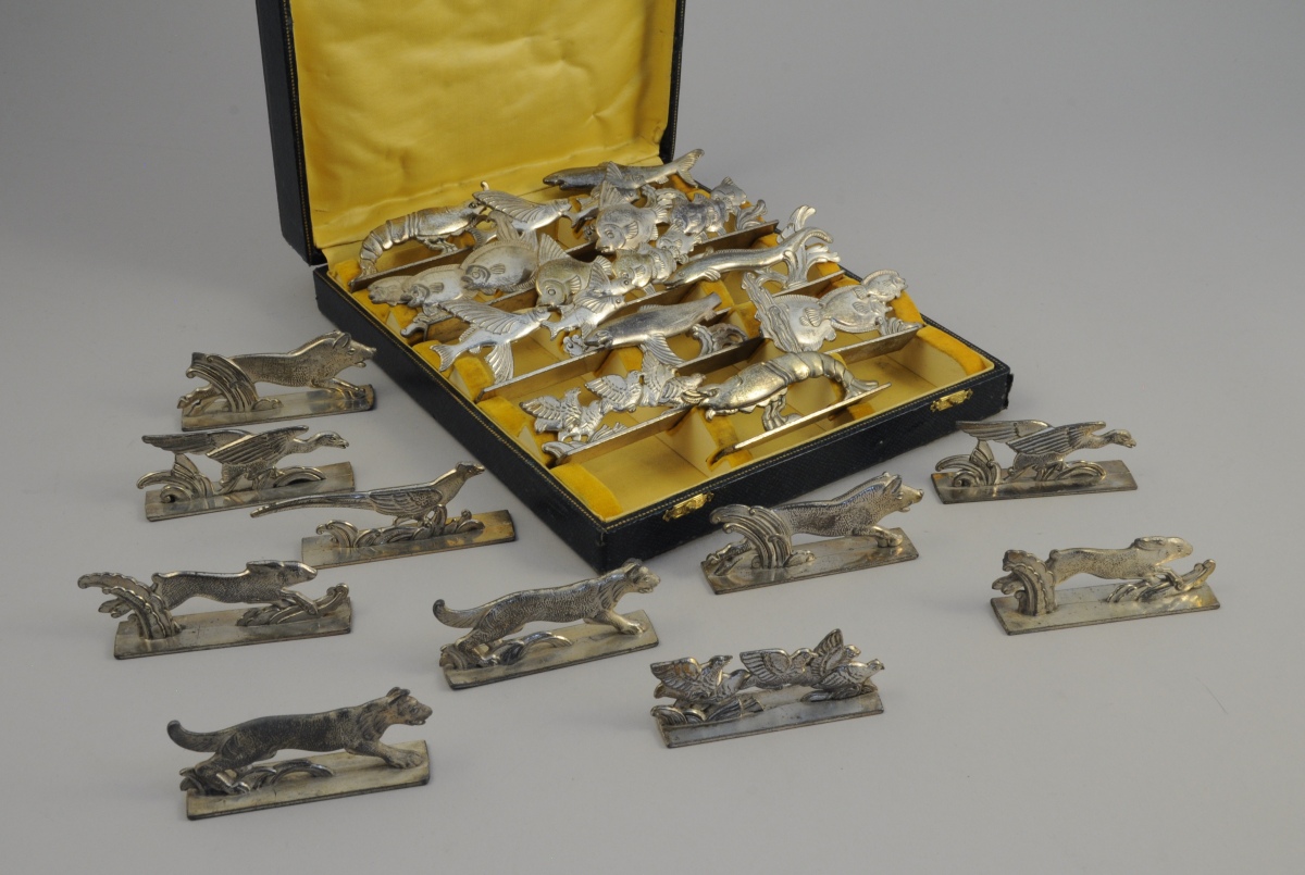 Suite de 23 PORTE-COUTEAUX en métal argenté figurant divers animaux tels que chien, canard, exocet, sanglier, poissons, lièvres, cailles...