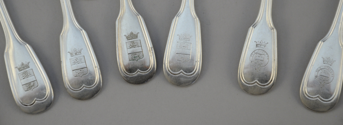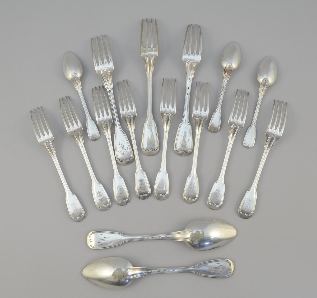-CHRISTOFLE. Suite de six FOURCHETTES À ENTREMETS, modèle filets-contour, aux armes de la famille de Chefdebien Zagarriga timbrées d'une couronne de marquis.