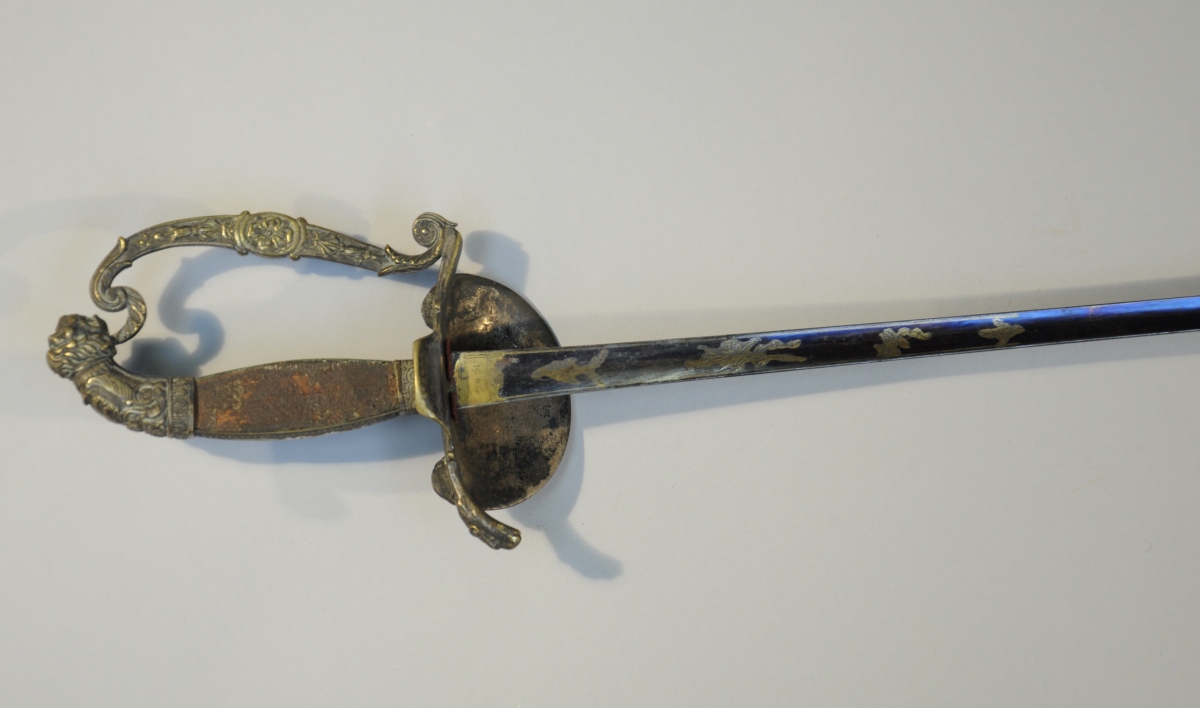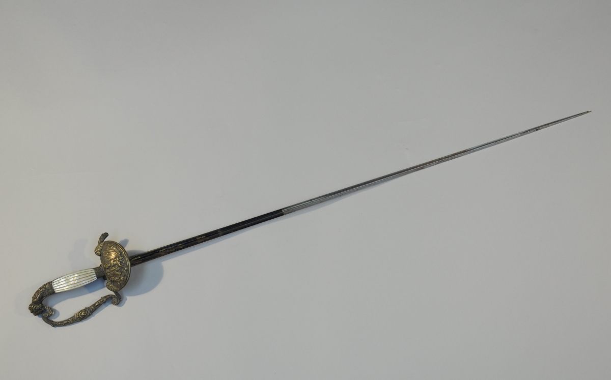 ÉPÉE D'OFFICIER, monture en laiton ciselé. Le clavier figurant une allégorie de la guerre. Fusée à plaquettes de nacre cannelées, pommeau en forme de crosse terminé par un mufle de lion. Lame triangulaire, bleuie et dorée au tiers. Signée au talon : "KS" (?).