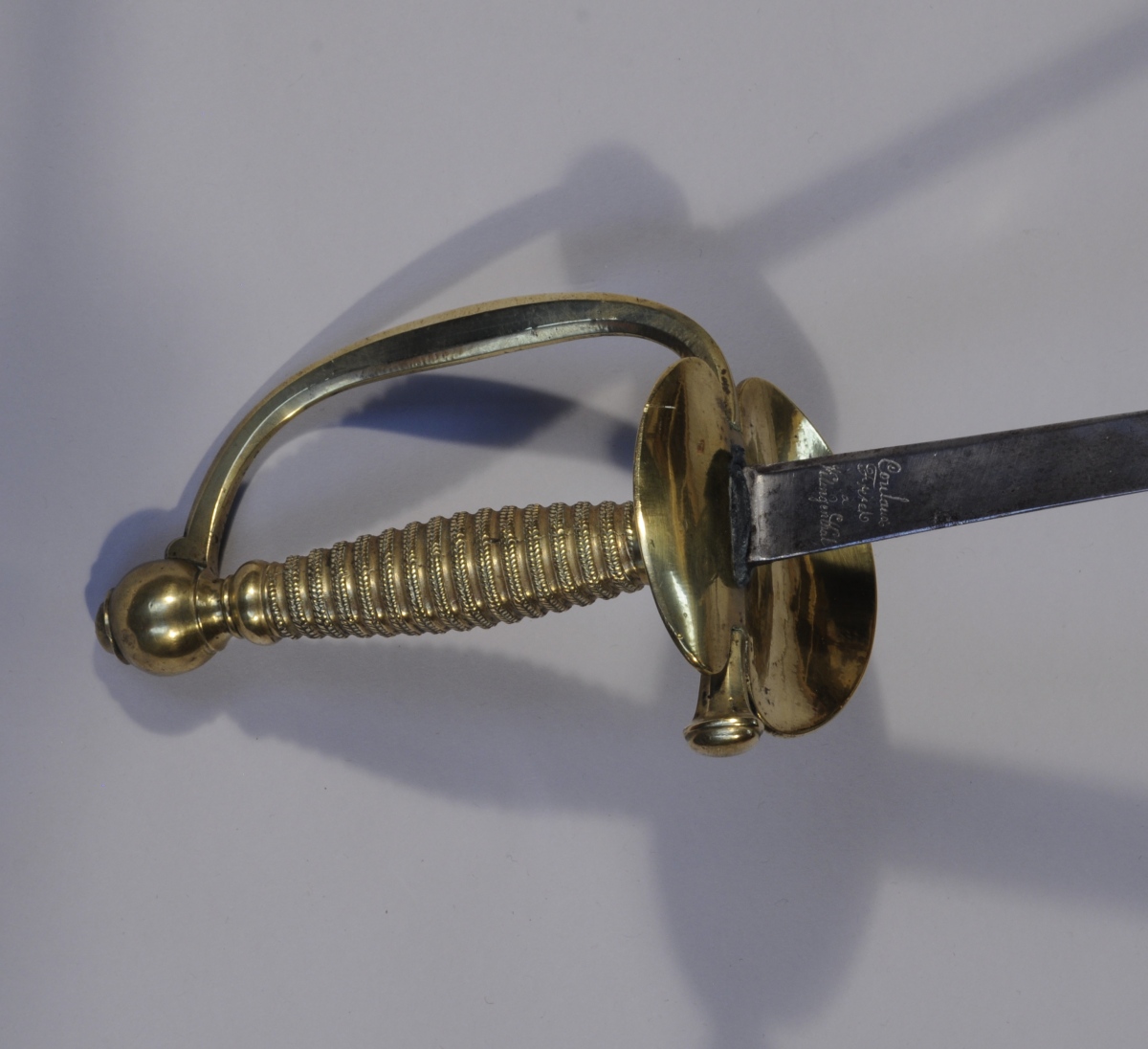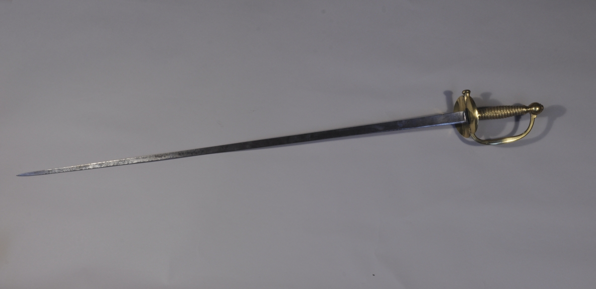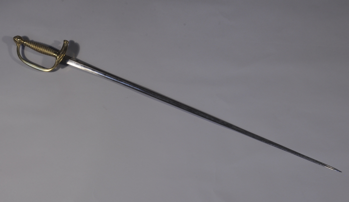 ÉPÉE D'OFFICIER DE GRENADIERS DE LA GARDE ROYALE, modèle 1816. Monture en laiton, le clavier aux armes de Frances (biffées), la fusée ciselée à l'imitation du filigranne, le pommeau orné d'une grenade. Lame triangulaire signée "Coulaux / Frères / à / Klingenthal".